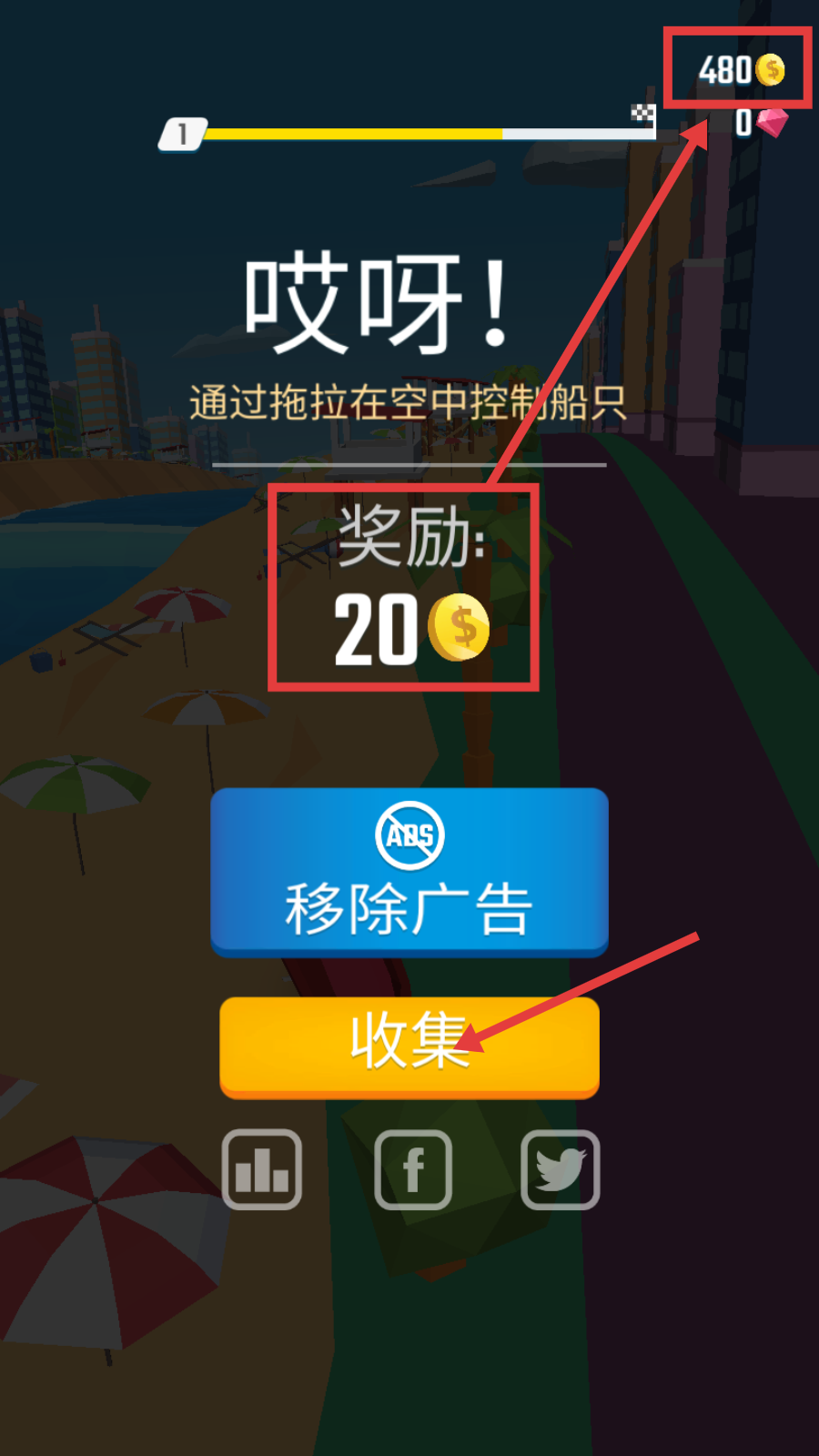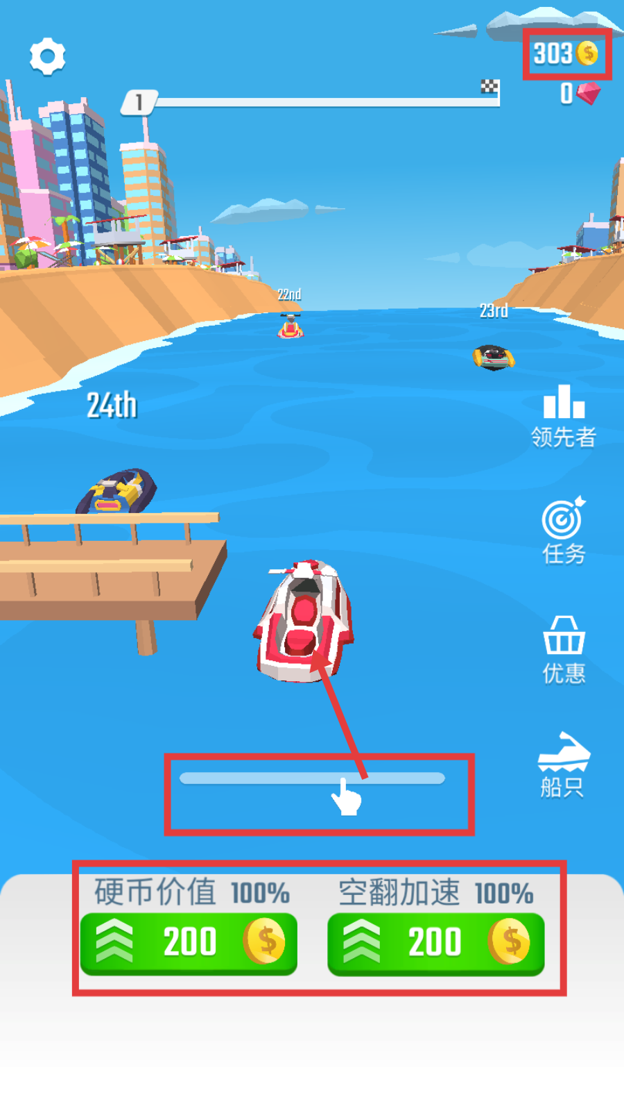 1、游戏初始,可花费金币升级【硬币价值-100%】与【空翻加速-100%】,再通过滑动屏幕操控船只前行。