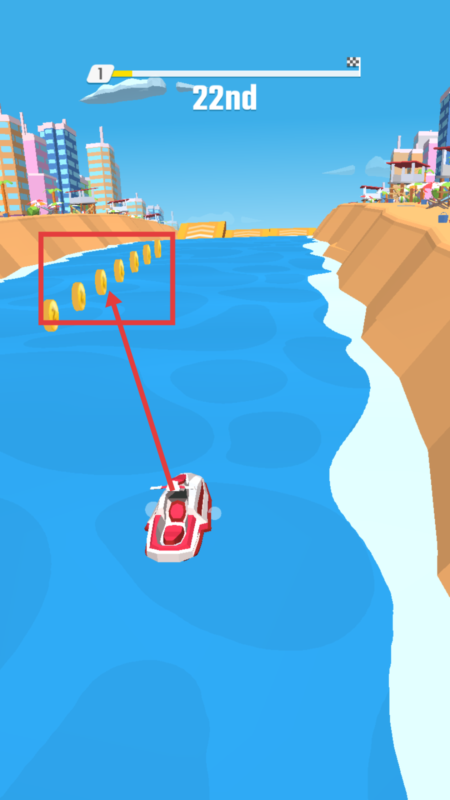 2、在赛道里,尽量让船只朝着金币排列的区域行驶,收集金币以获取更多资源。