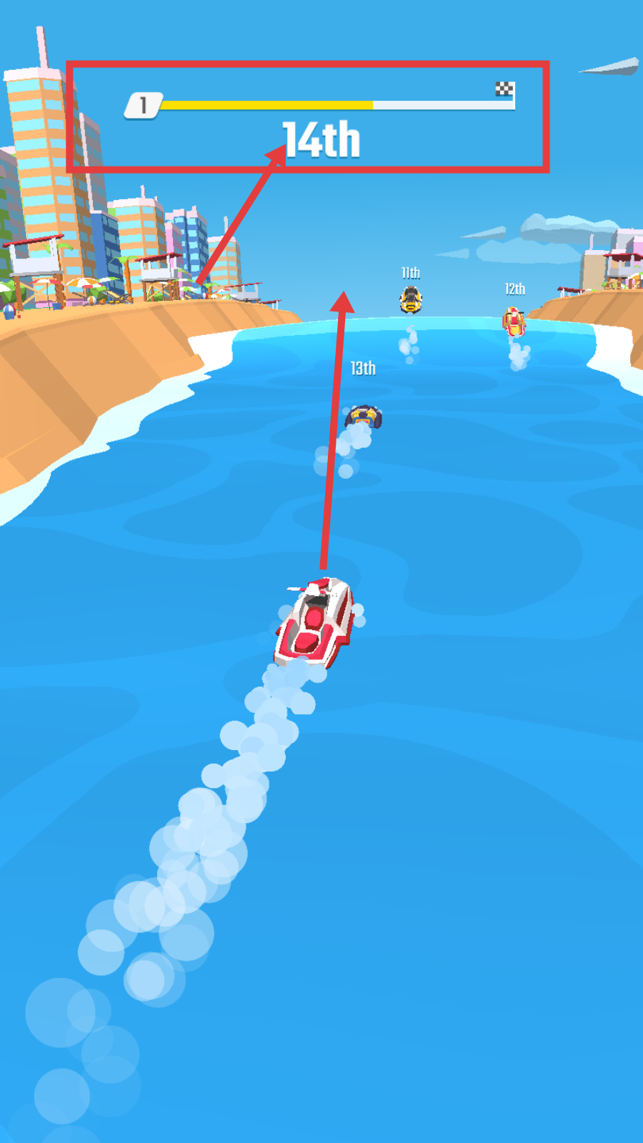 3、比赛时持续加速前进,尽力提升排名,从后方不断超越其他船只。