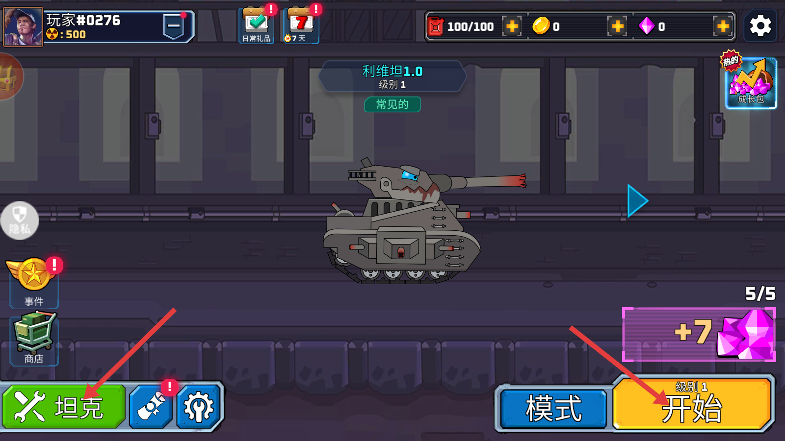 1、进入游戏后,选择【利维坦1.0】坦克,点击“开始”按钮,开启关卡挑战。