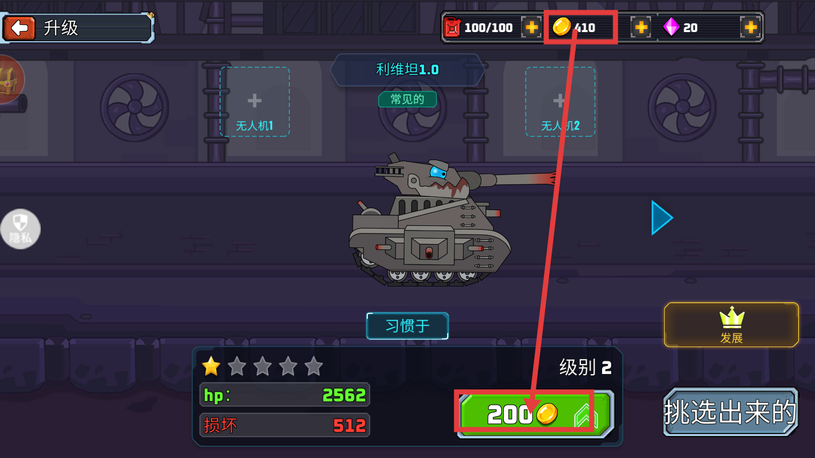 2、在升级界面,花费【200-金币】升级坦克,提升HP等属性,增强坦克战斗力。