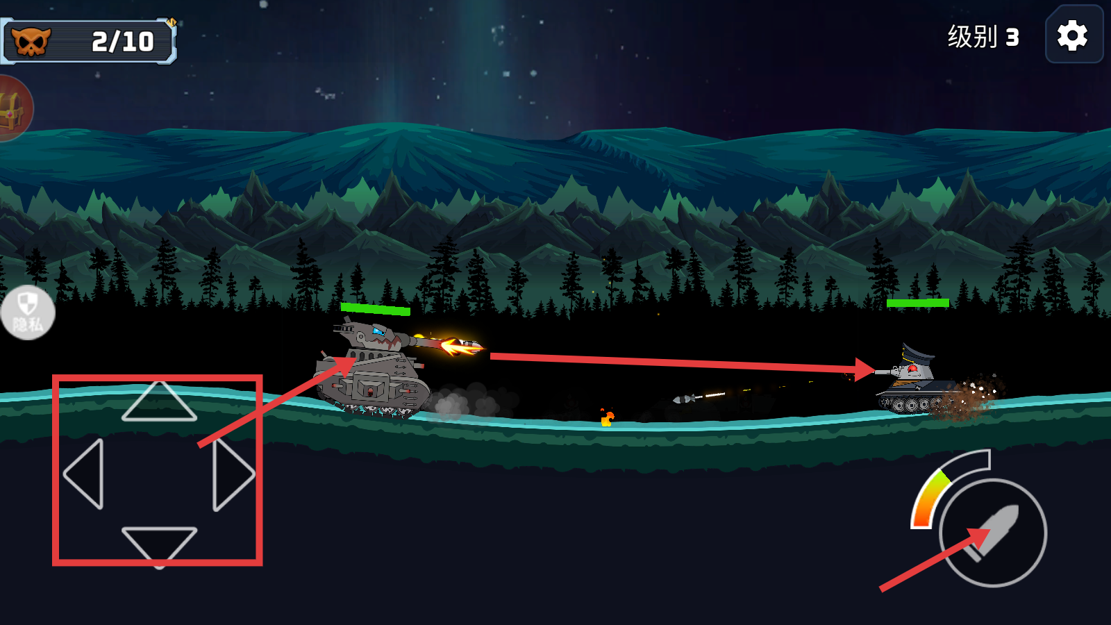 3、战斗时,通过方向键控制坦克移动,点击炮弹图标发射炮弹,攻击敌方坦克。