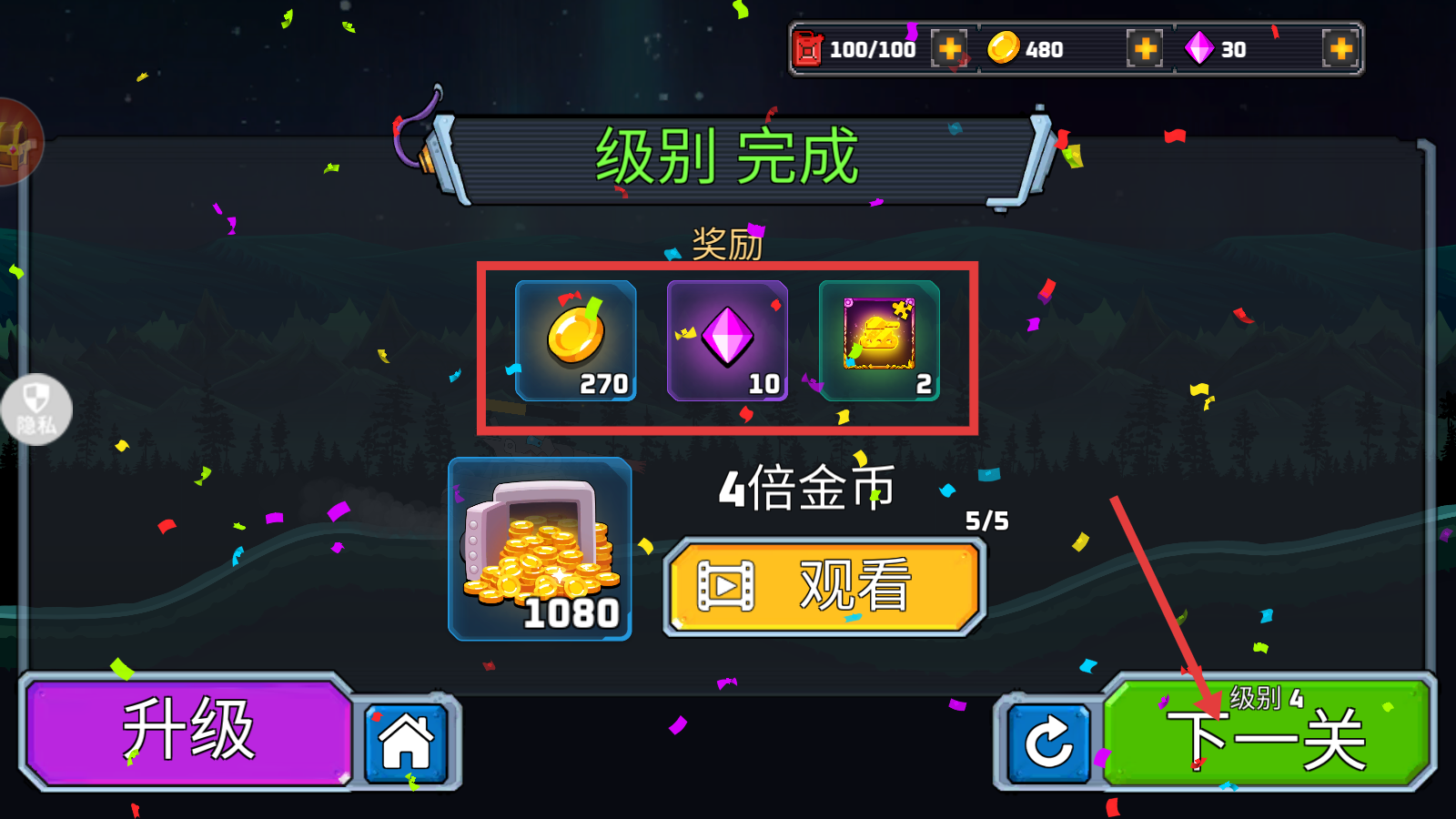 4、关卡完成后,领取【金币-270】【钻石-10】等奖励,点击“下一关”继续挑战。