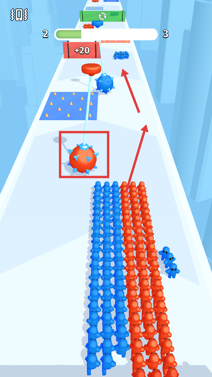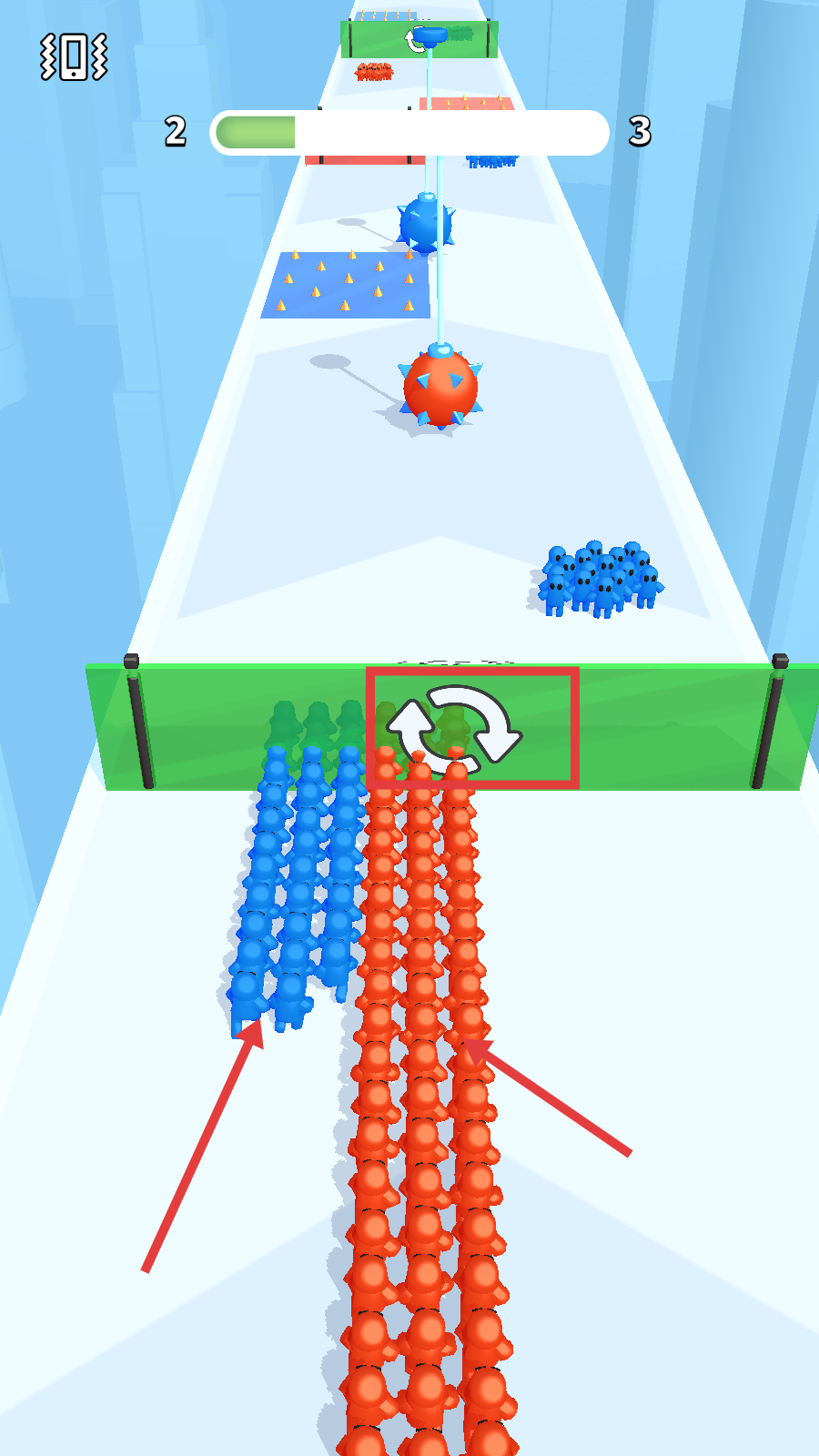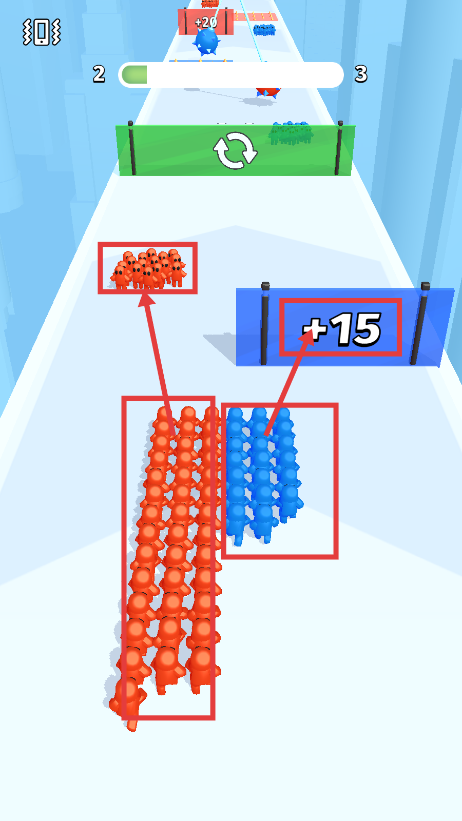1、操控队伍前进时,遇到【+15】这类增加数量的道具,尽量让队伍通过,壮大红色或蓝色小人队伍的规模。