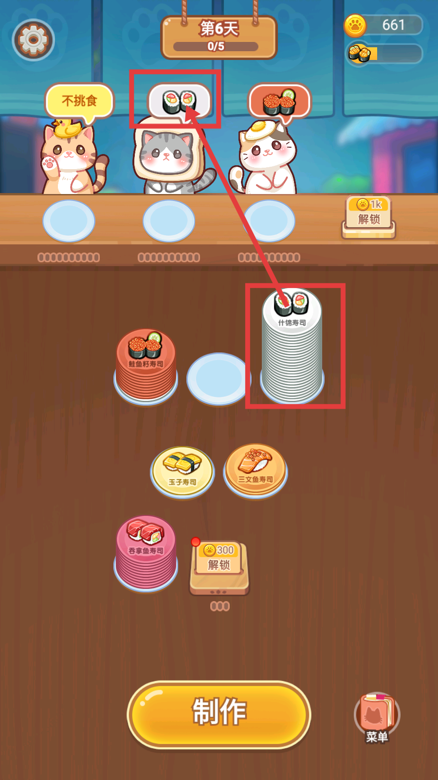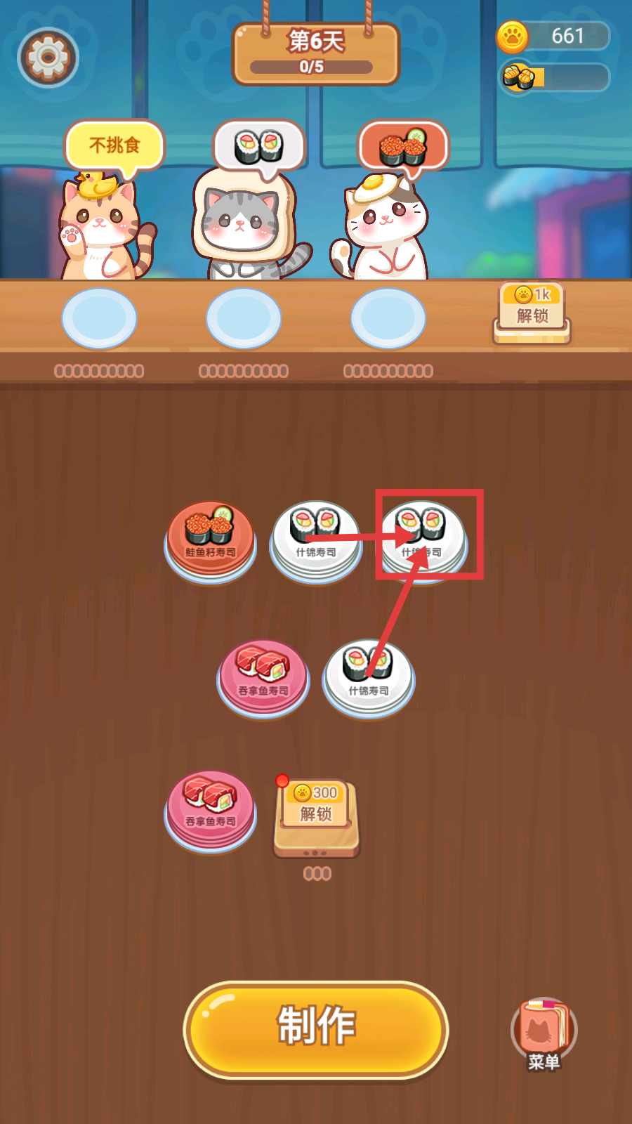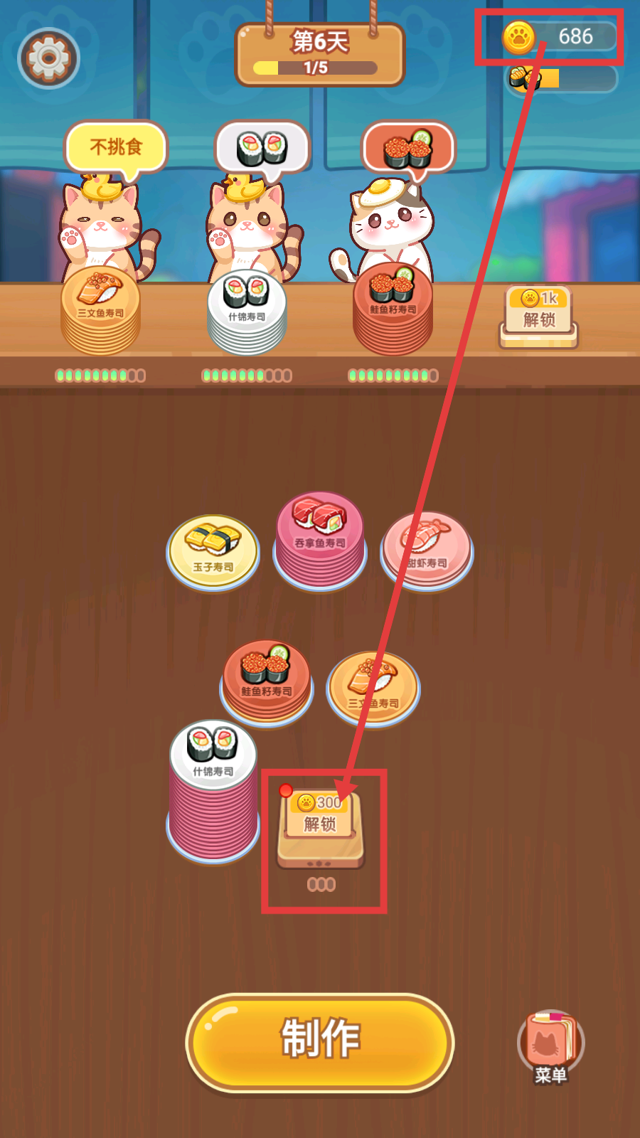 3、成功完成猫咪的寿司订单后会获得金币,可使用金币点击【300-解锁】,开启更多寿司种类或功能。
