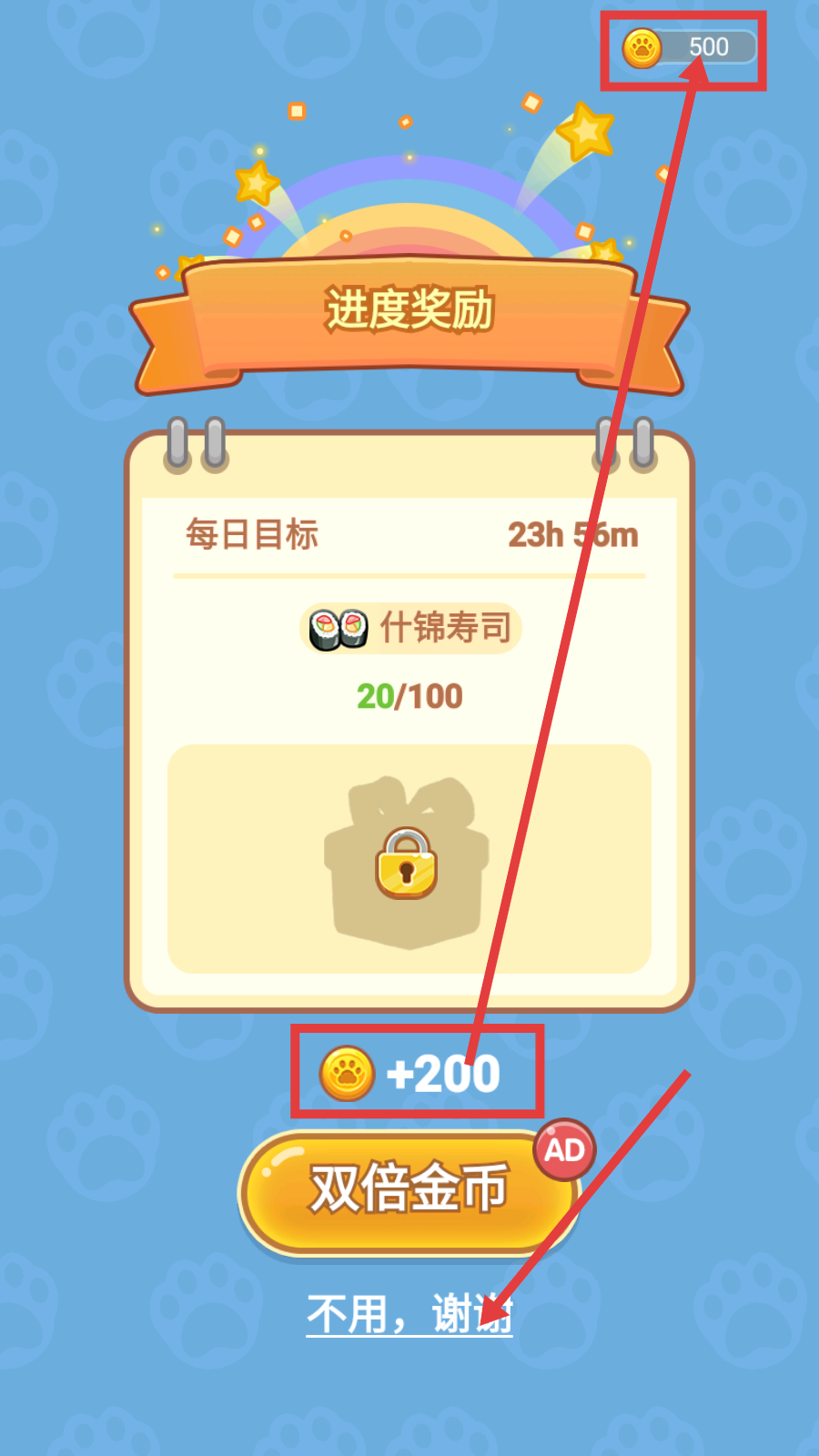 4、达成每日目标等进度时会触发【进度奖励】,能领取对应金币,也可选择“双倍金币”(观看广告)获取更多金币。