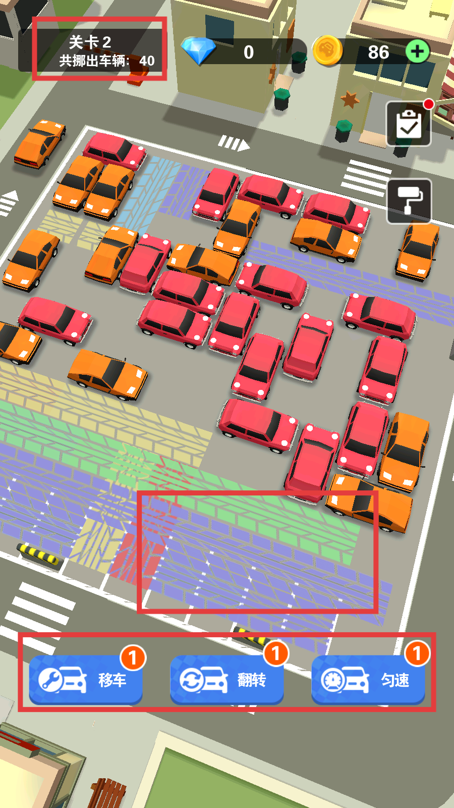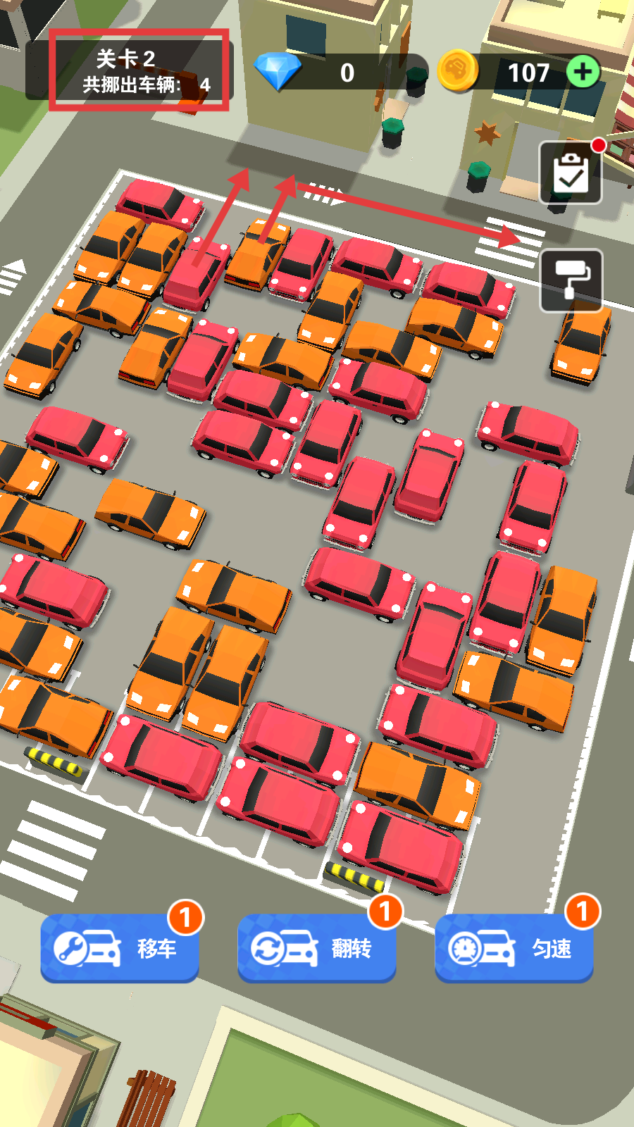 2、在【关卡2】中,观察车辆分布,规划车辆移动路线,逐步挪出车辆。