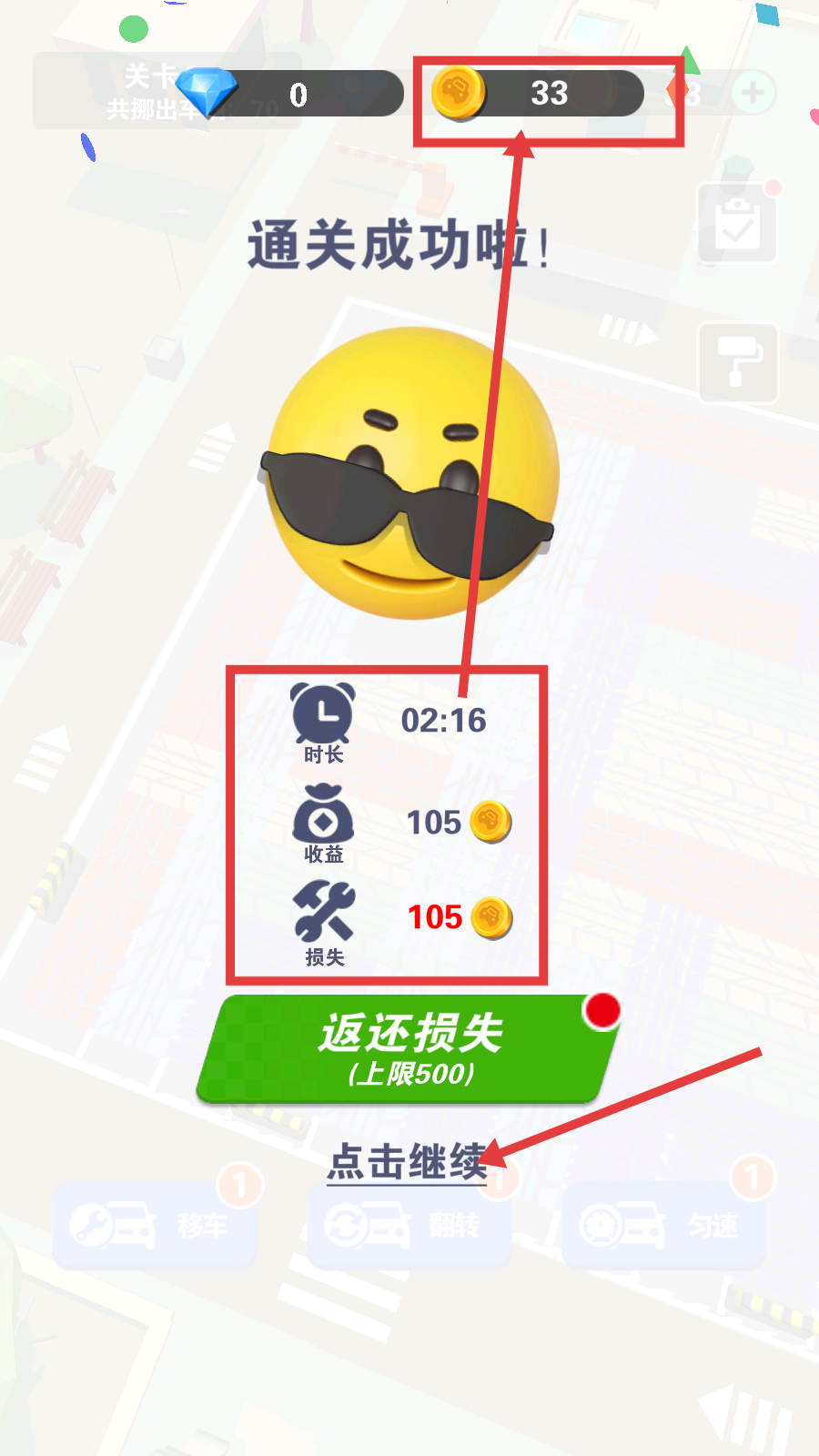 4、通关成功后,可获得金币收益,还能看到时长、损失等数据,点击【点击继续】可进入下一部分,或选择【返还损失】。