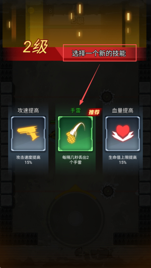 4、如何升级技能,点击选择一个新技能,如“手雷”来增强角色能力。