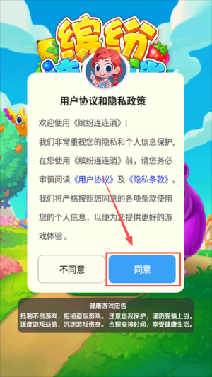 1、首先,阅读并同意用户协议和隐私政策,点击“同意”按钮以进入游戏。