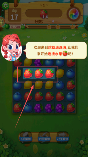 1、开启水果消除:进入游戏选择关卡,明确 “连接三个及以上相同水果、完成创意挑战” 目标,熟悉水果拖动与连接规则。