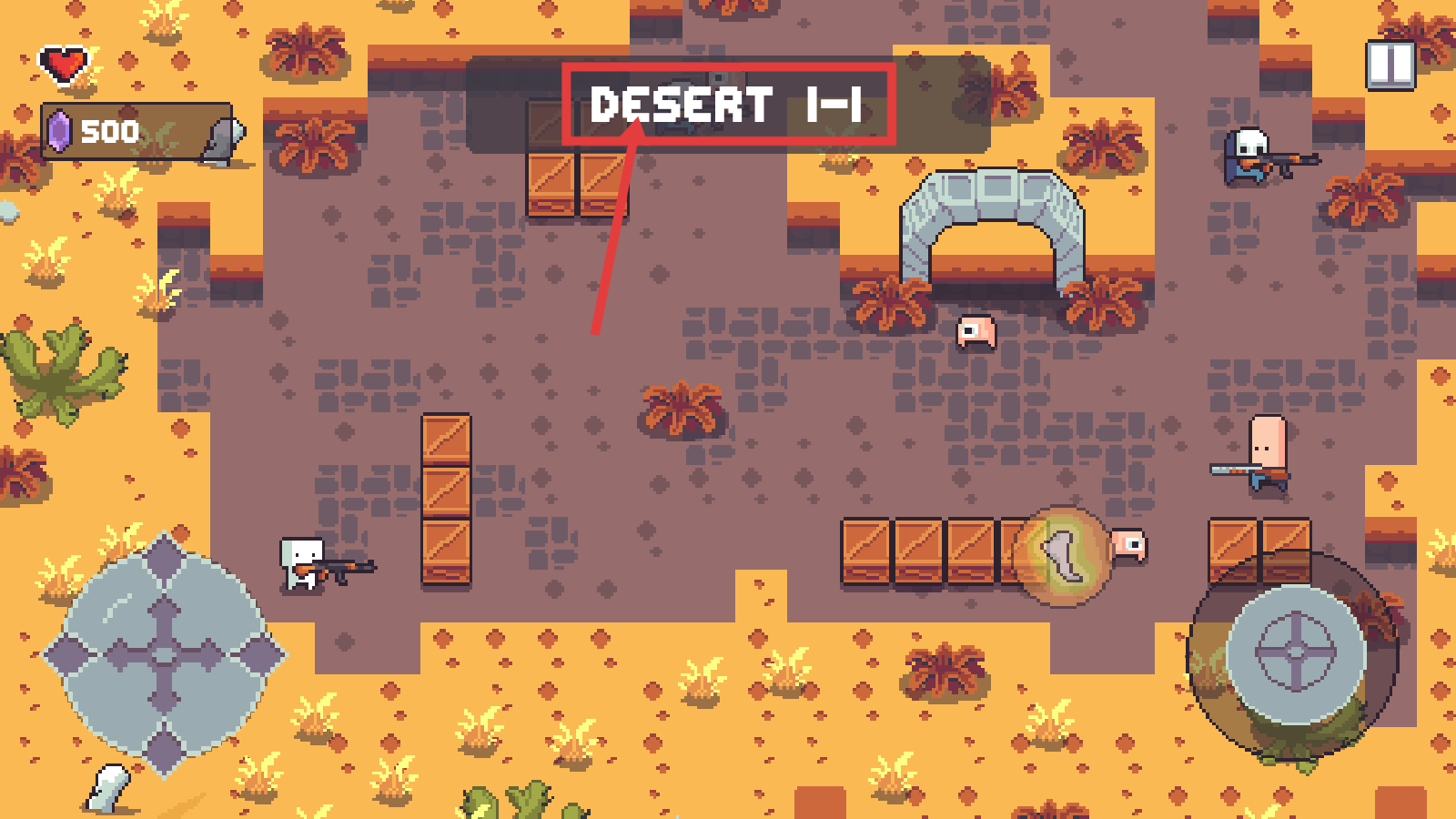 1、进入【DESERT-1-1】关卡后,先观察沙漠场景里的木箱、植物等地形,熟悉环境,为后续移动和战斗做准备。