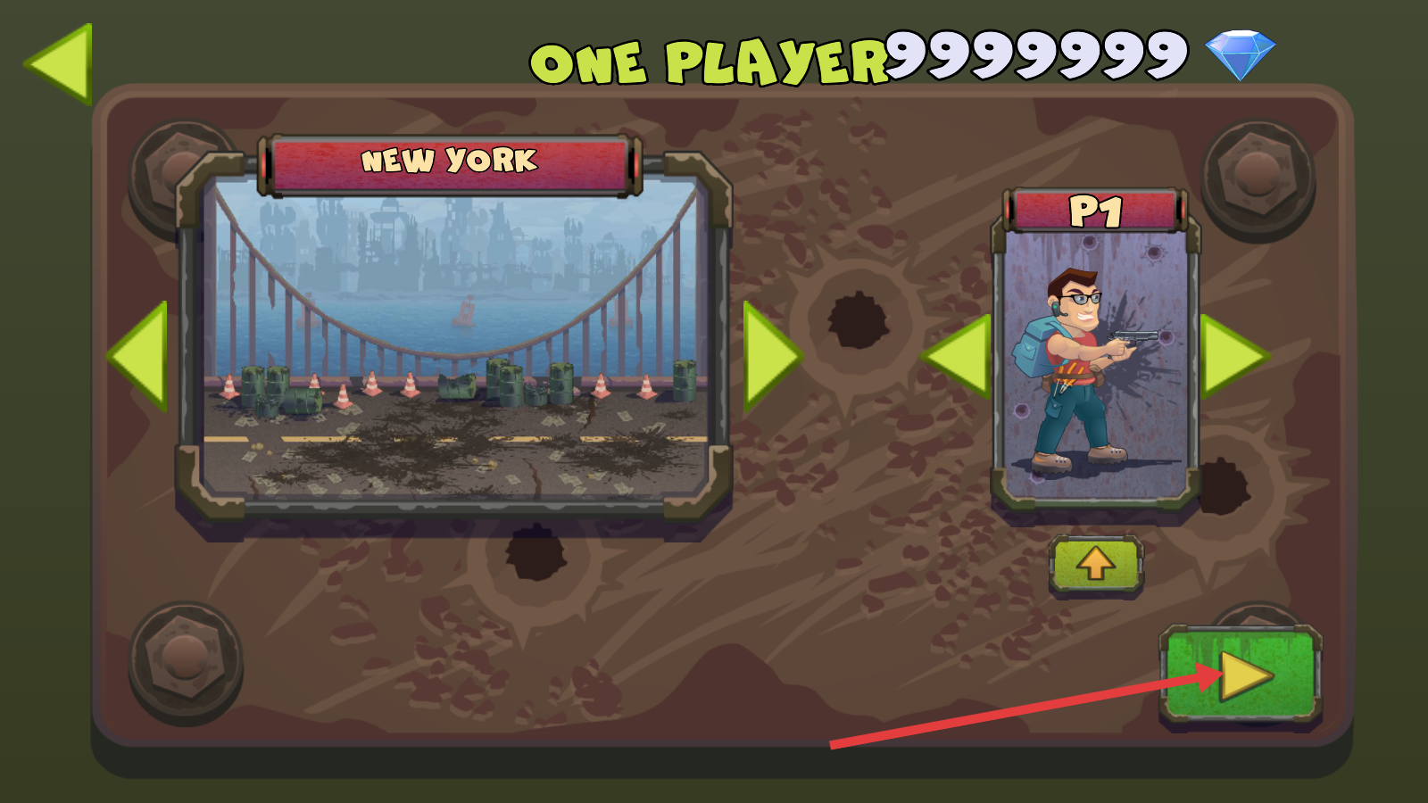 1、选择【NEW-YORK】关卡与【P1】角色,点击右下角绿色箭头,进入纽约场景的战斗。