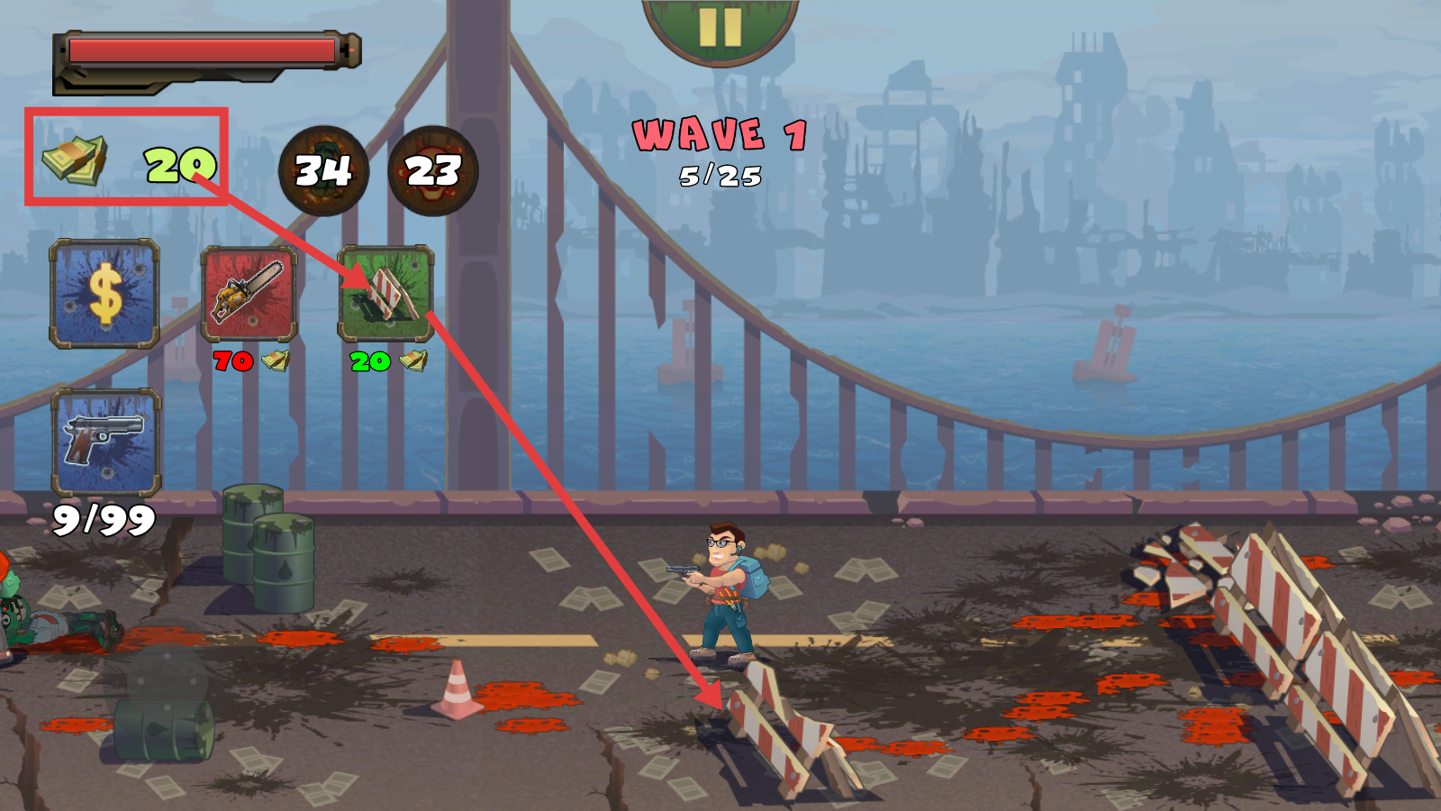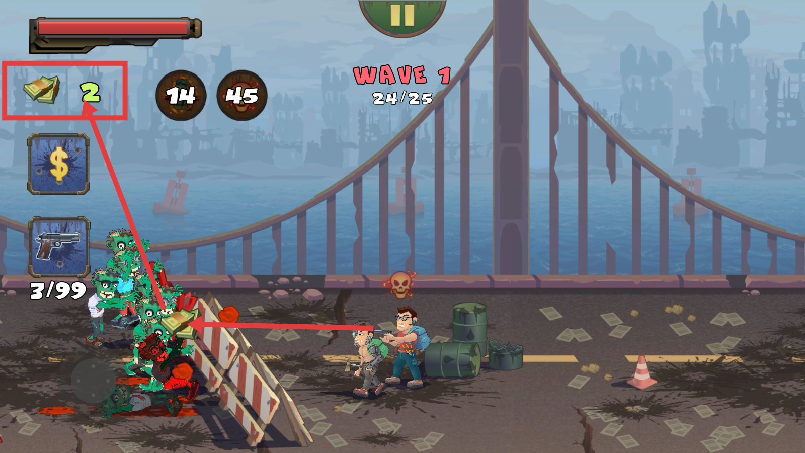 3、击杀僵尸可获取金钱,留意左上角金钱计数,及时收集掉落的金钱资源,积累财富。