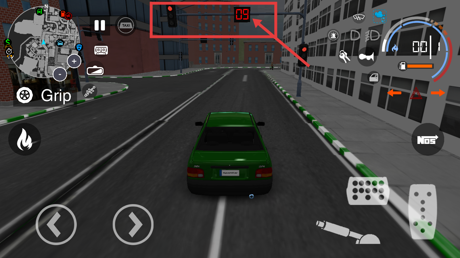2、驾驶过程中,用左侧左右箭头按钮控制车辆转向,右侧按键控制油门与刹车,还可借助【NOS】功能提升车速。