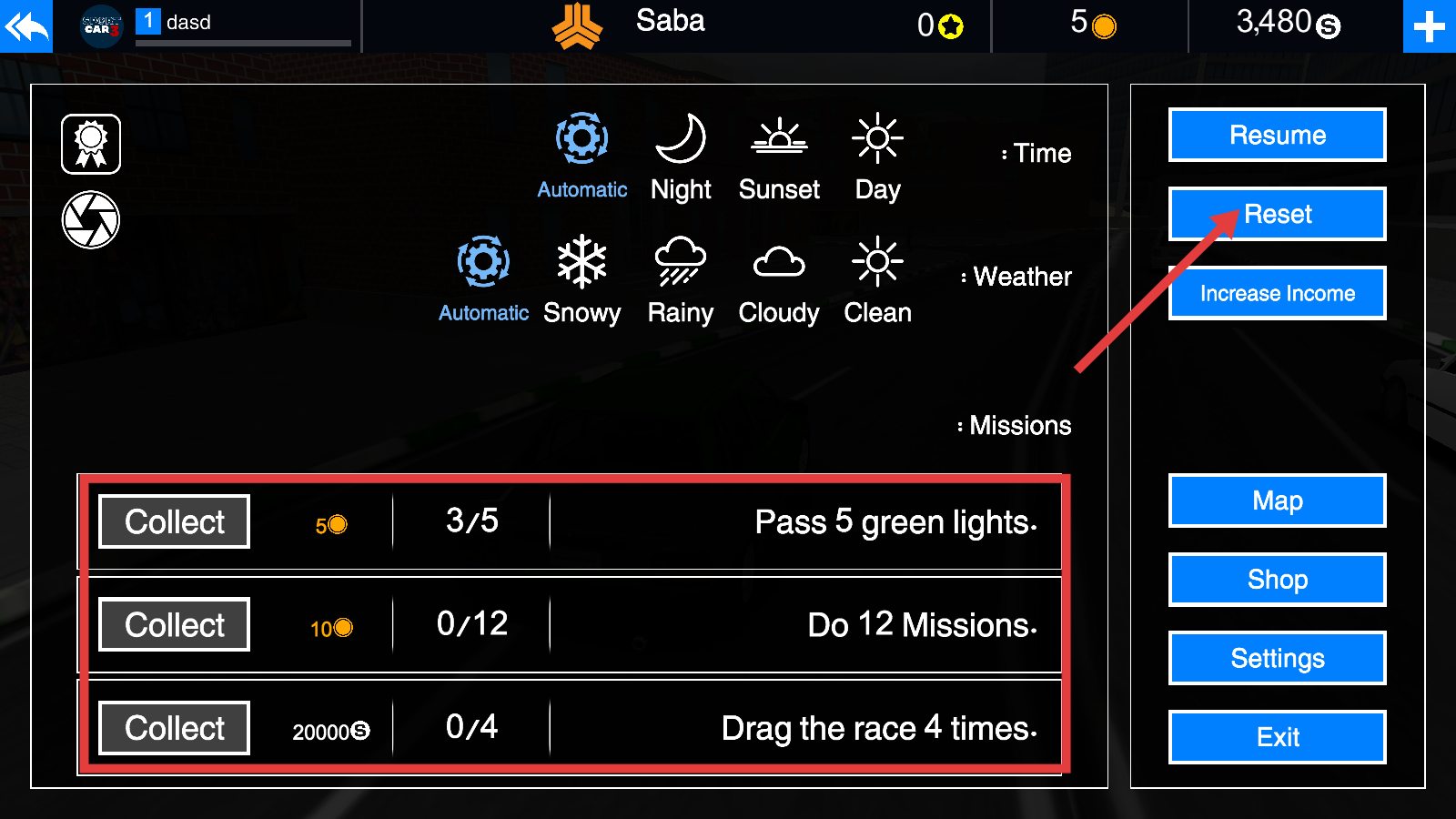 4、完成任务面板里的任务,如【Pass-5-green-lights】【Do-12-Missions】等可获取奖励;若需重置,点击【Reset】按钮。
