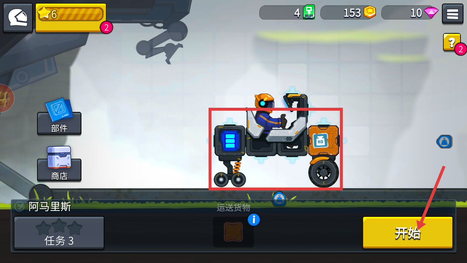 1、组装好载具后,点击黄色【开始】按钮,进入【运送货物】的任务3,开启运输挑战。