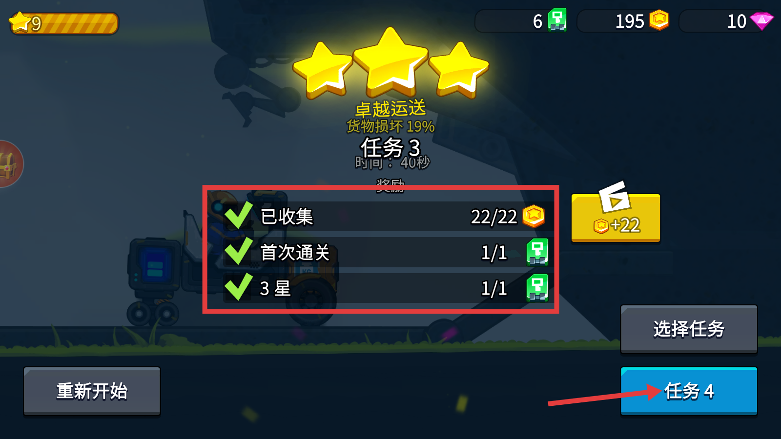 4、完成任务3后,可获取金币、道具等奖励,还能达成3星评价,随后点击【任务4】继续挑战。