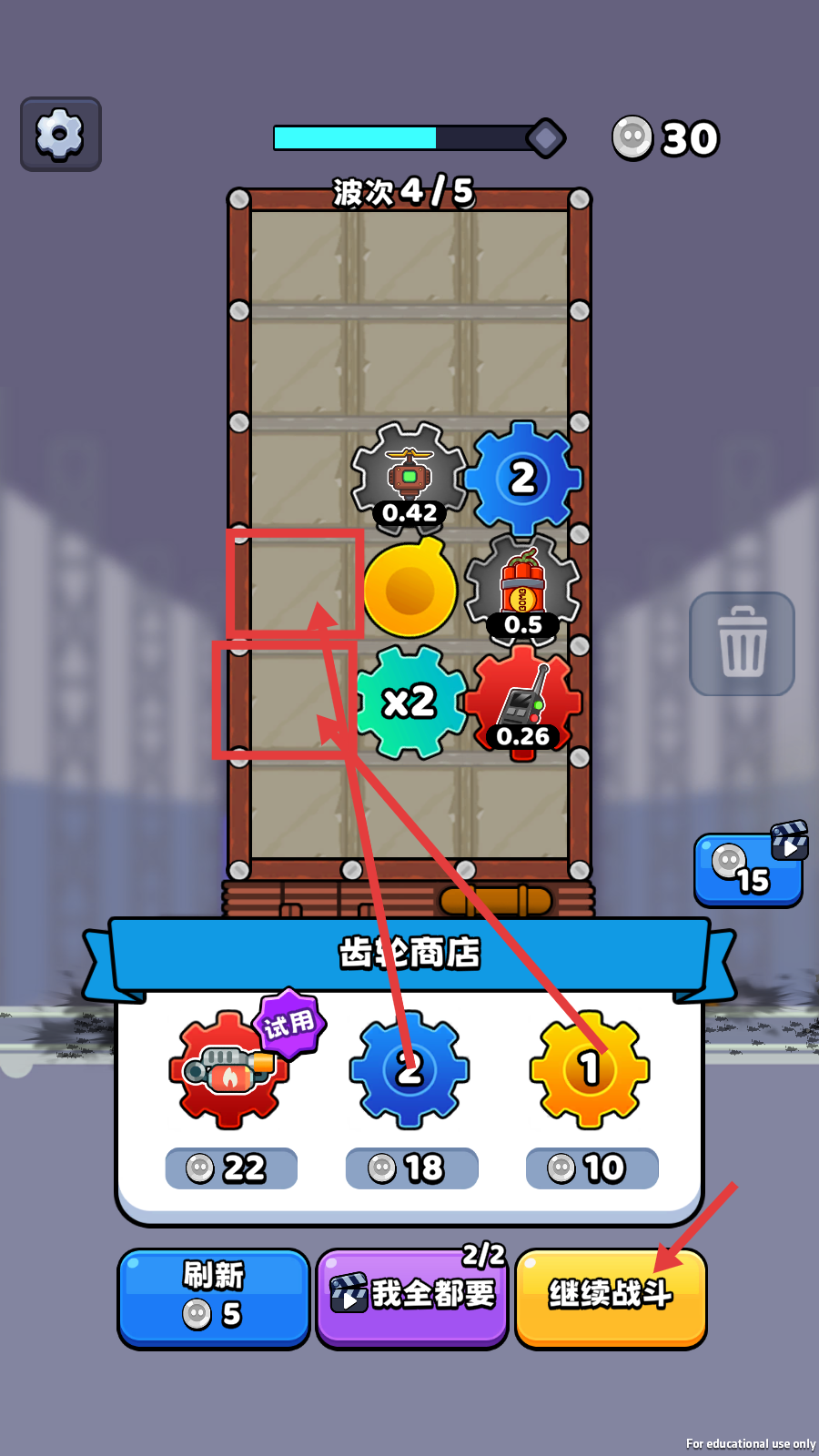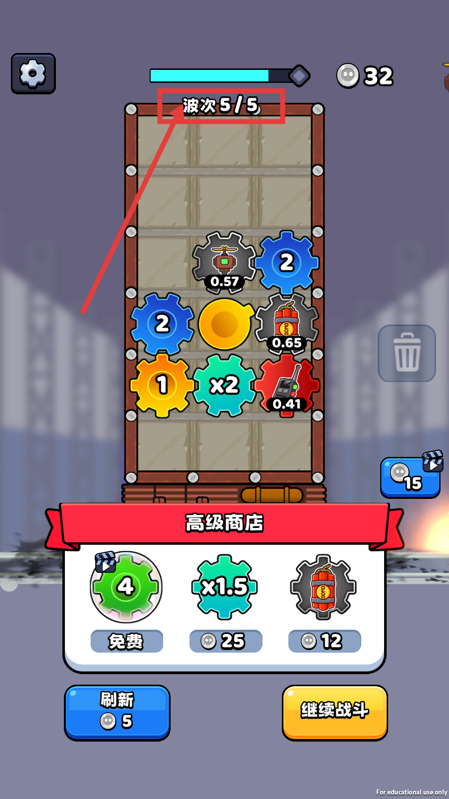 4、完成【波次4/5】后,进入【波次5/5】,可在【高级商店】选购更强力的齿轮(如×1.5增益齿轮),提升后续战斗能力。