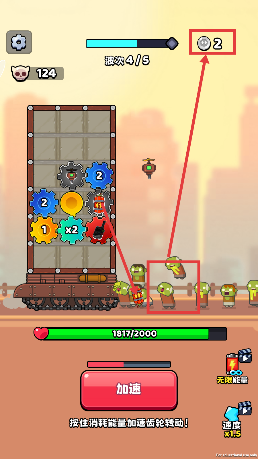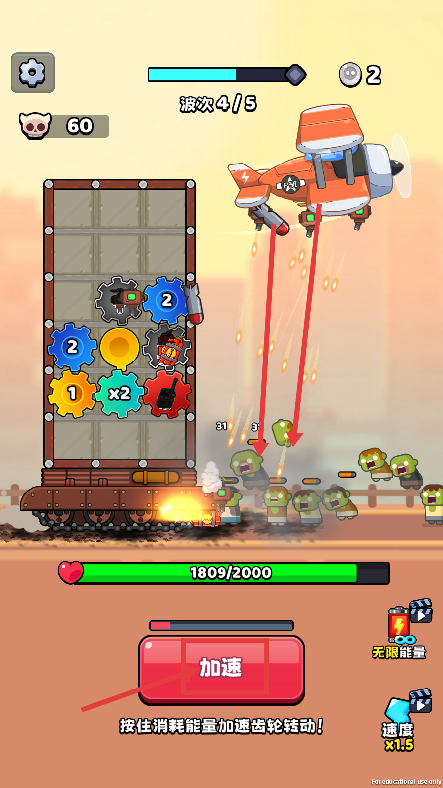 3、按住红色【加速】按钮,消耗能量让齿轮加速转动,还能触发飞机空袭等强力攻击,快速清理大量僵尸。