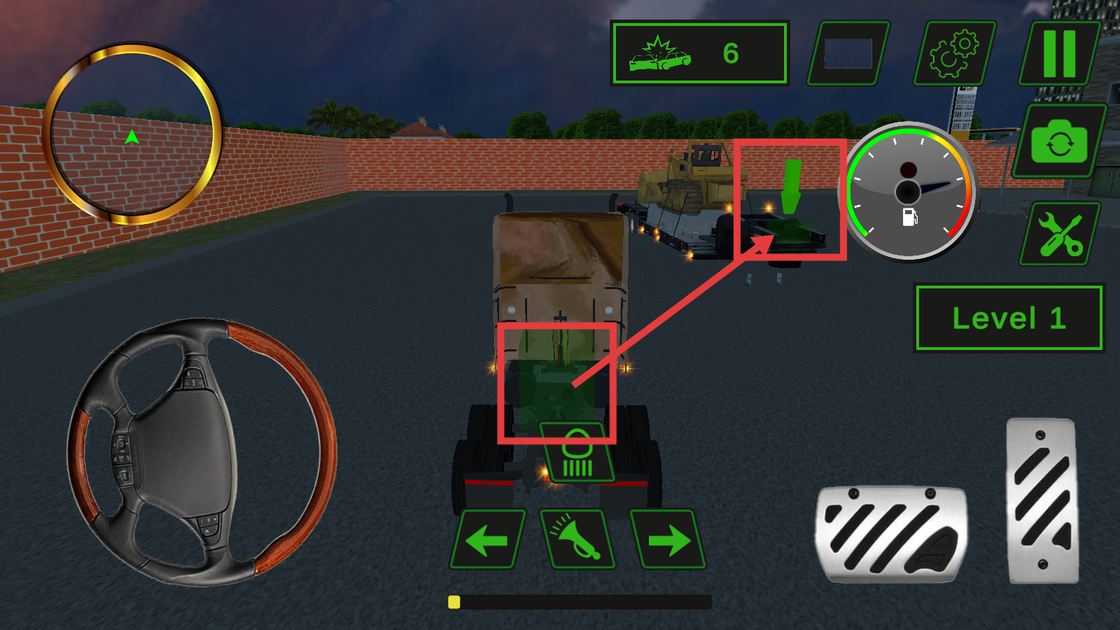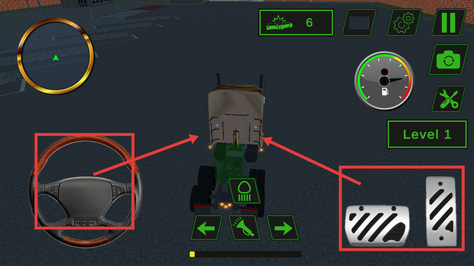 2、通过左侧方向盘控制车辆方向,右侧油门和刹车踏板调节速度,操控卡车行驶。