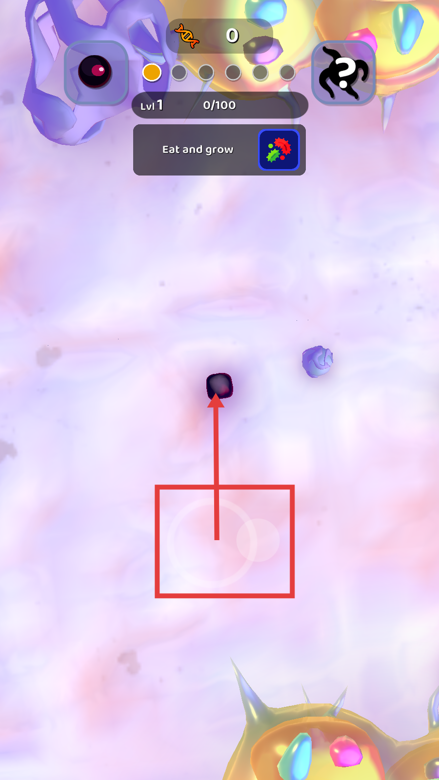 1、游戏开始时,操控小黑点移动,遵循【Eatandgrow】提示,移动去接触可吞噬的物体,开启成长之旅。