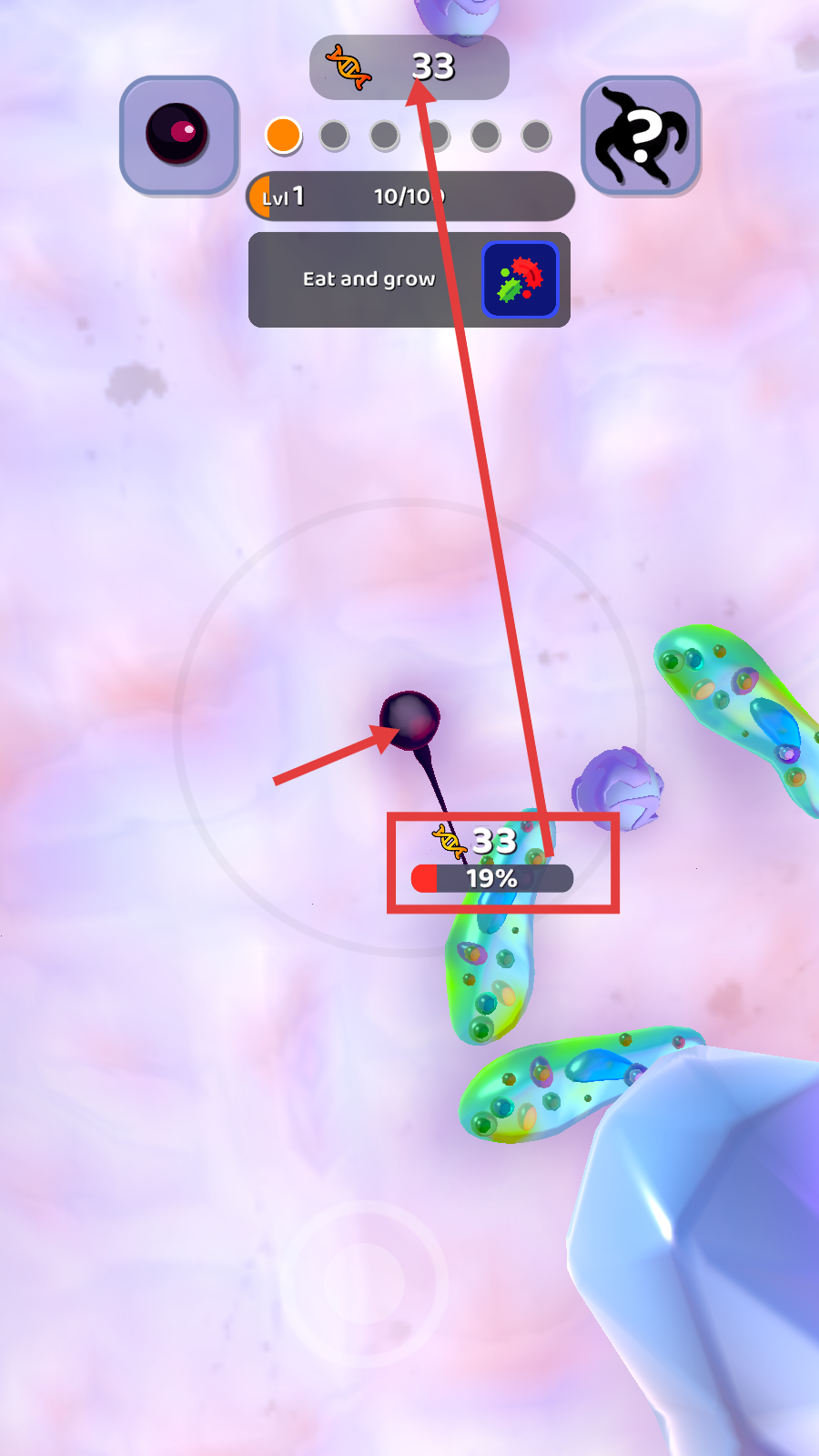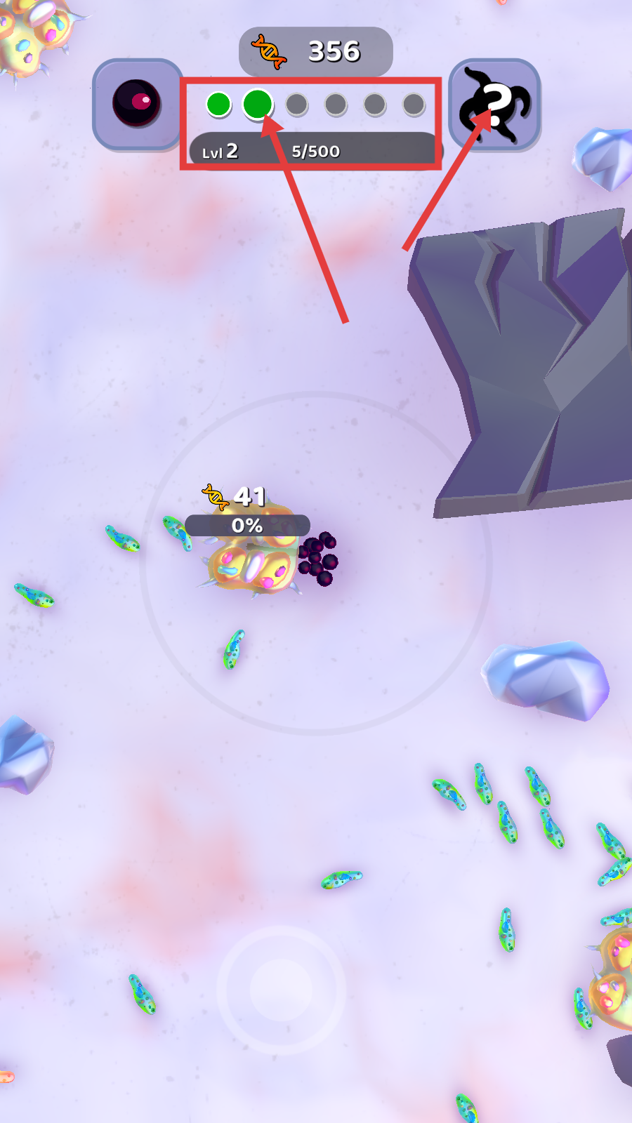 2、吞噬过程中,留意DNA数值变化,当出现吞噬进度条时,持续吞噬目标,积累DNA,助力自身成长。