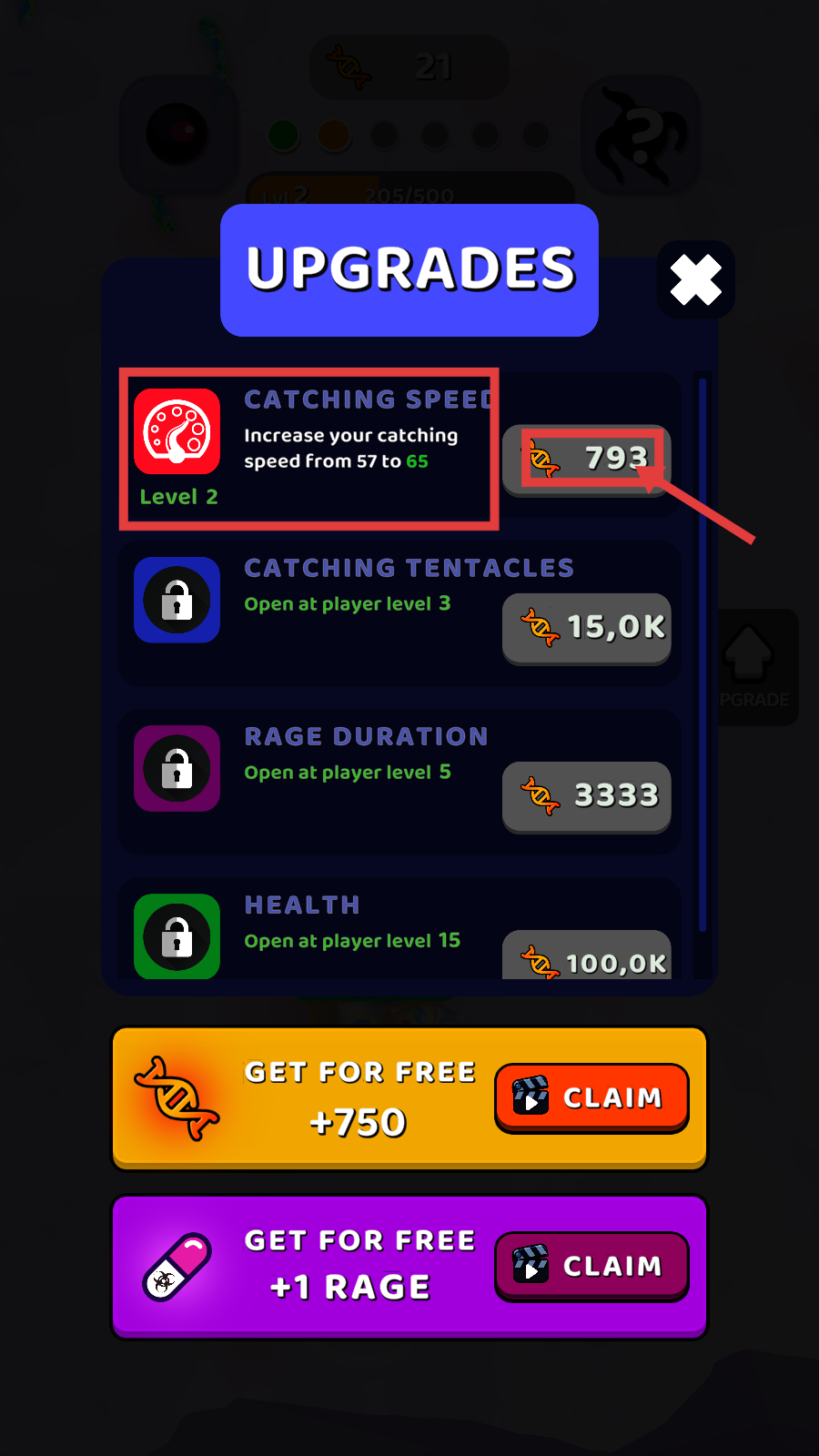 4、积攒足够DNA后,进入【UPGRADES】界面,可升级【CATCHINGSPEED】等属性,提升捕捉速度等能力,让成长更高效。