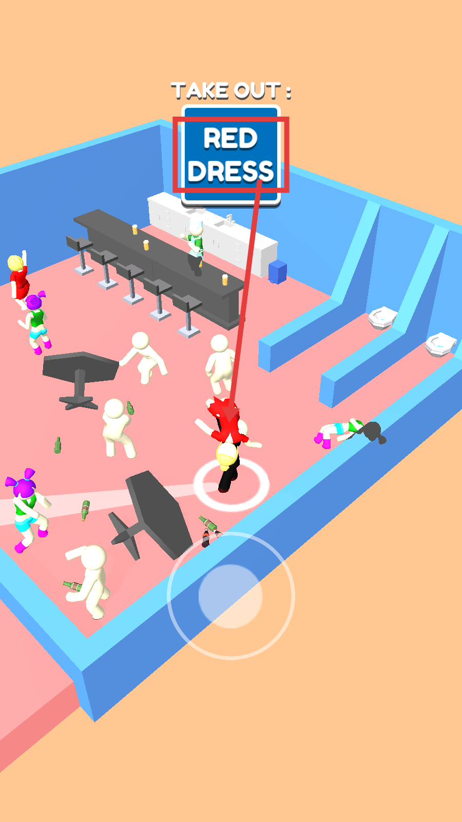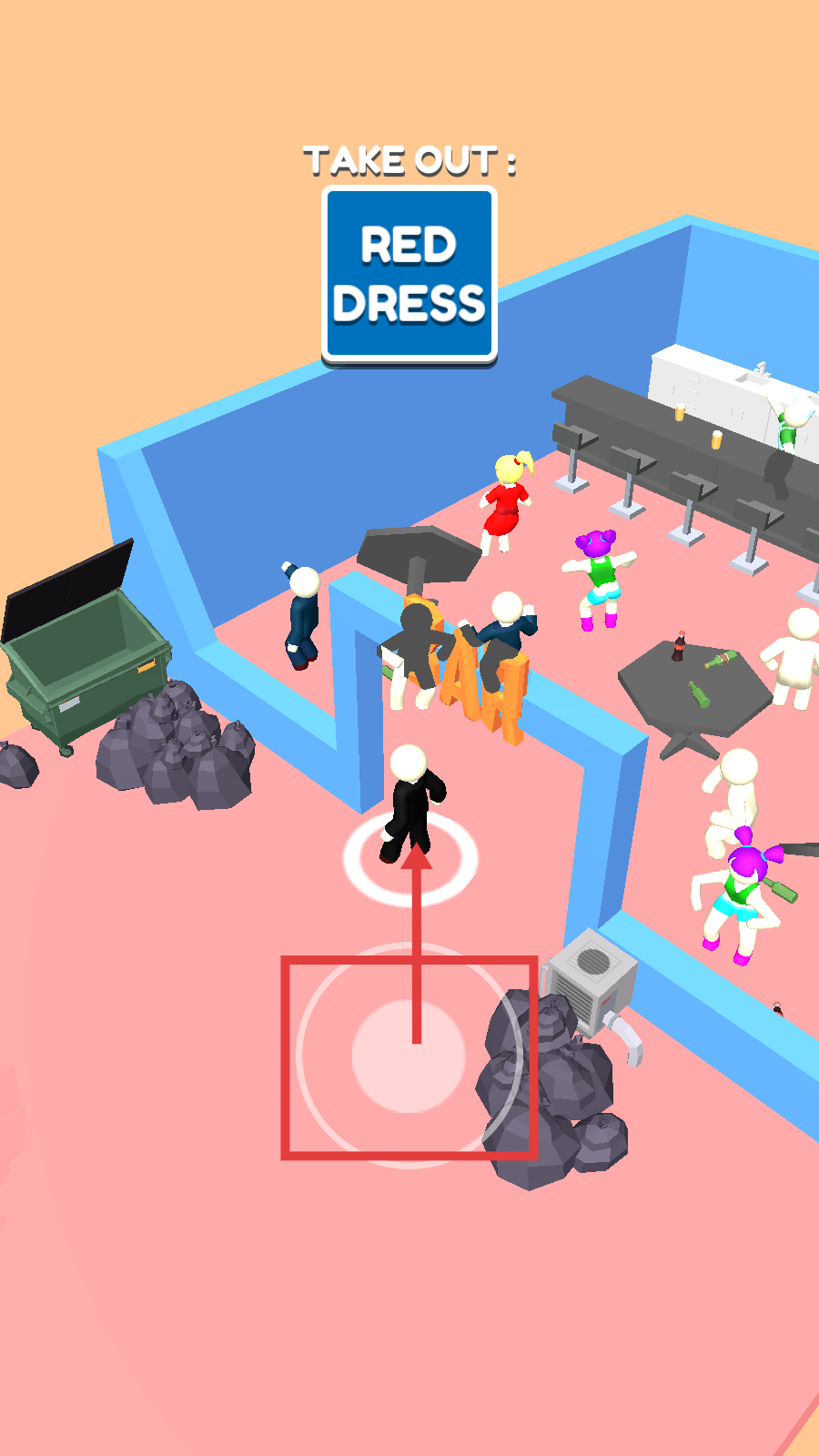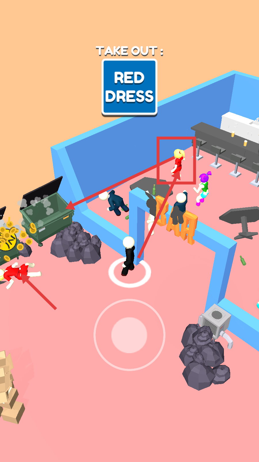 3、将穿【RED-DRESS】的角色拖拽至绿色垃圾桶处,完成“TAKEOUT”的任务要求。