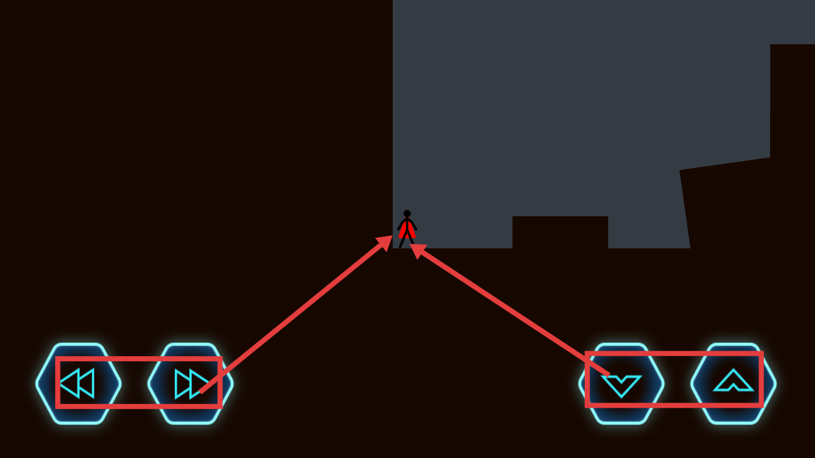 2、借助左下角左右箭头按钮控制火柴人移动方向,右下角上下箭头按钮调整其垂直位置,在场景中探索前行。