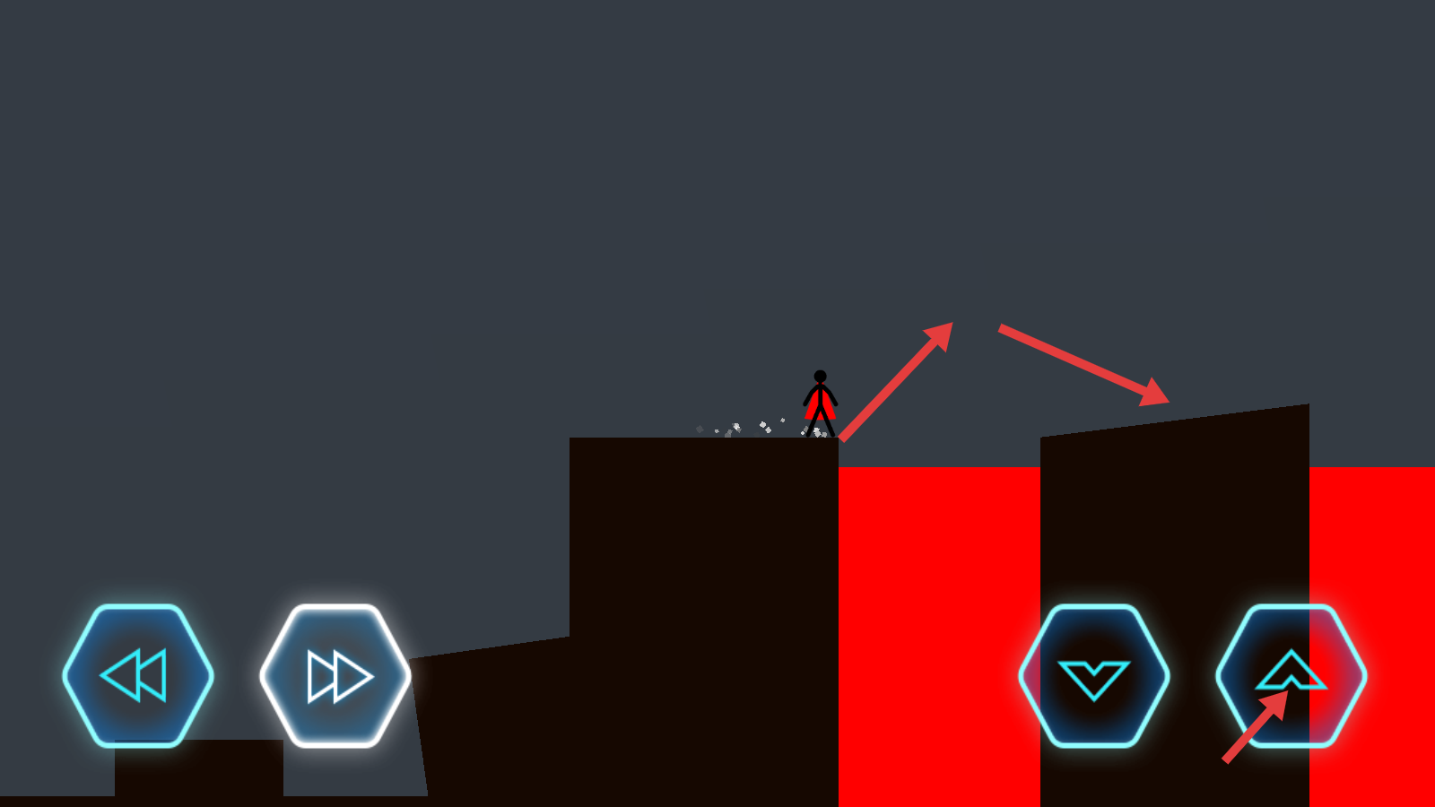 3、遇到平台间隙或障碍时,点击右下角向上箭头按钮,让火柴人跳跃,跨越至目标平台,需留意时机与距离。