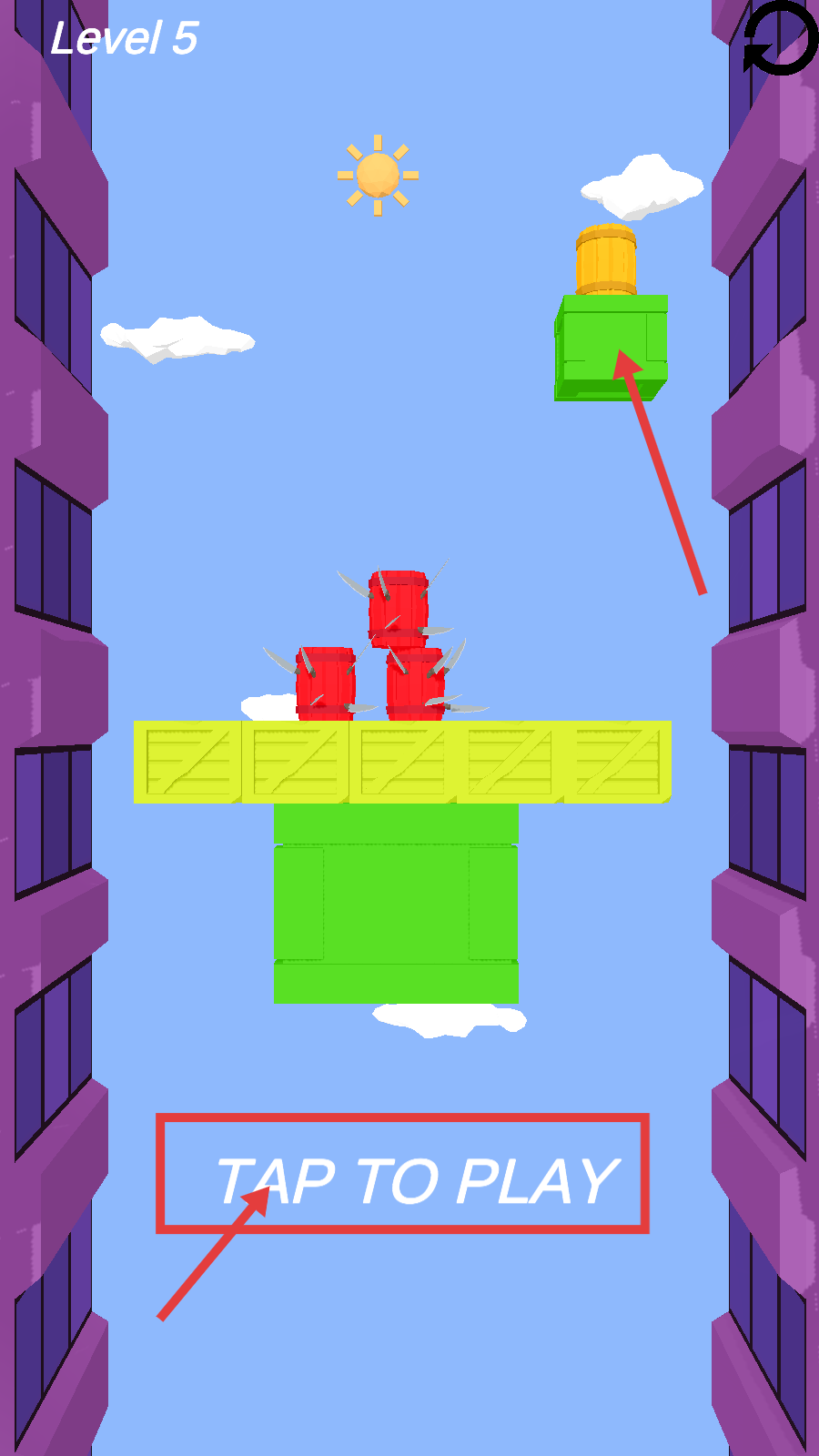 1、进入【Level-5】后,点击【TAP-TO-PLAY】,观察绿色方块与带刺红桶的位置,为后续操作做准备。