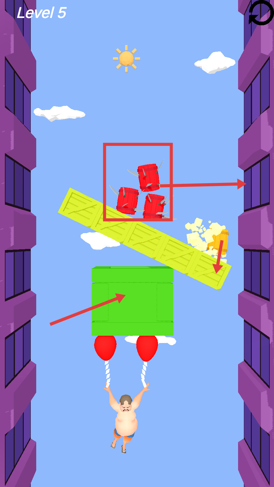 2、操作后带刺红桶被推离,黄色平台倾斜,需保证绿色方块下方的气球能顺利带动人物上升,规避危险。