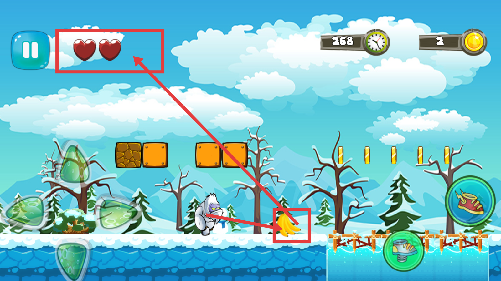 3、左上角的爱心代表生命值,要注意躲避危险,遇到香蕉等道具可拾取,能助力冒险或恢复状态,持续向右侧探索收集更多资源。