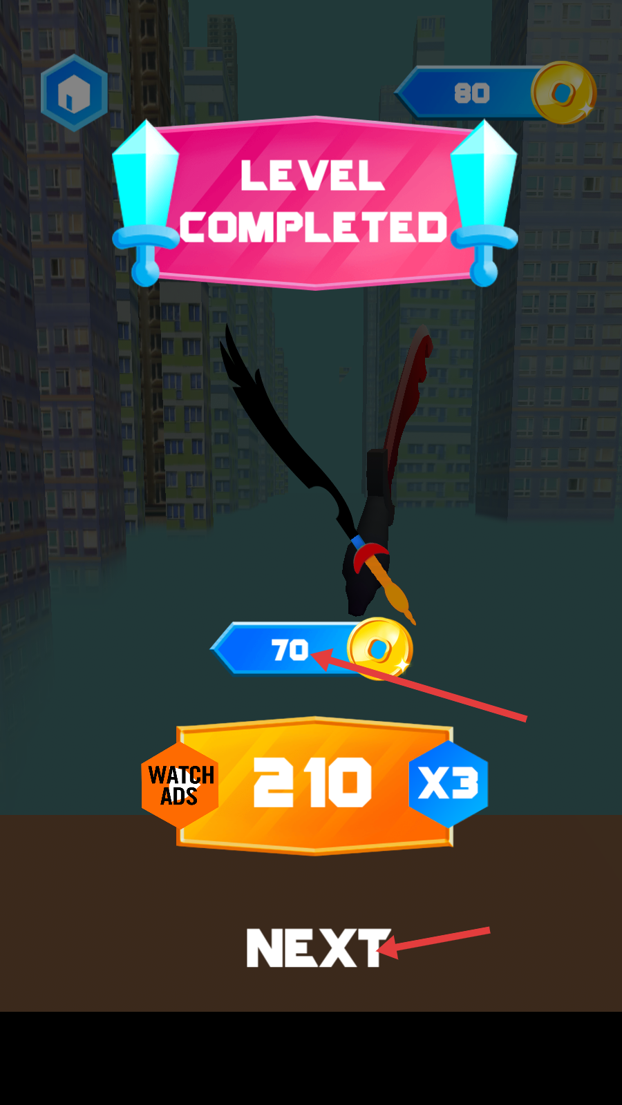 4、成功完成【LEVEL-2】后,界面显示【LEVEL-COMPLETED】,可获得【70】金币奖励,点击【NEXT】即可进入下一关。