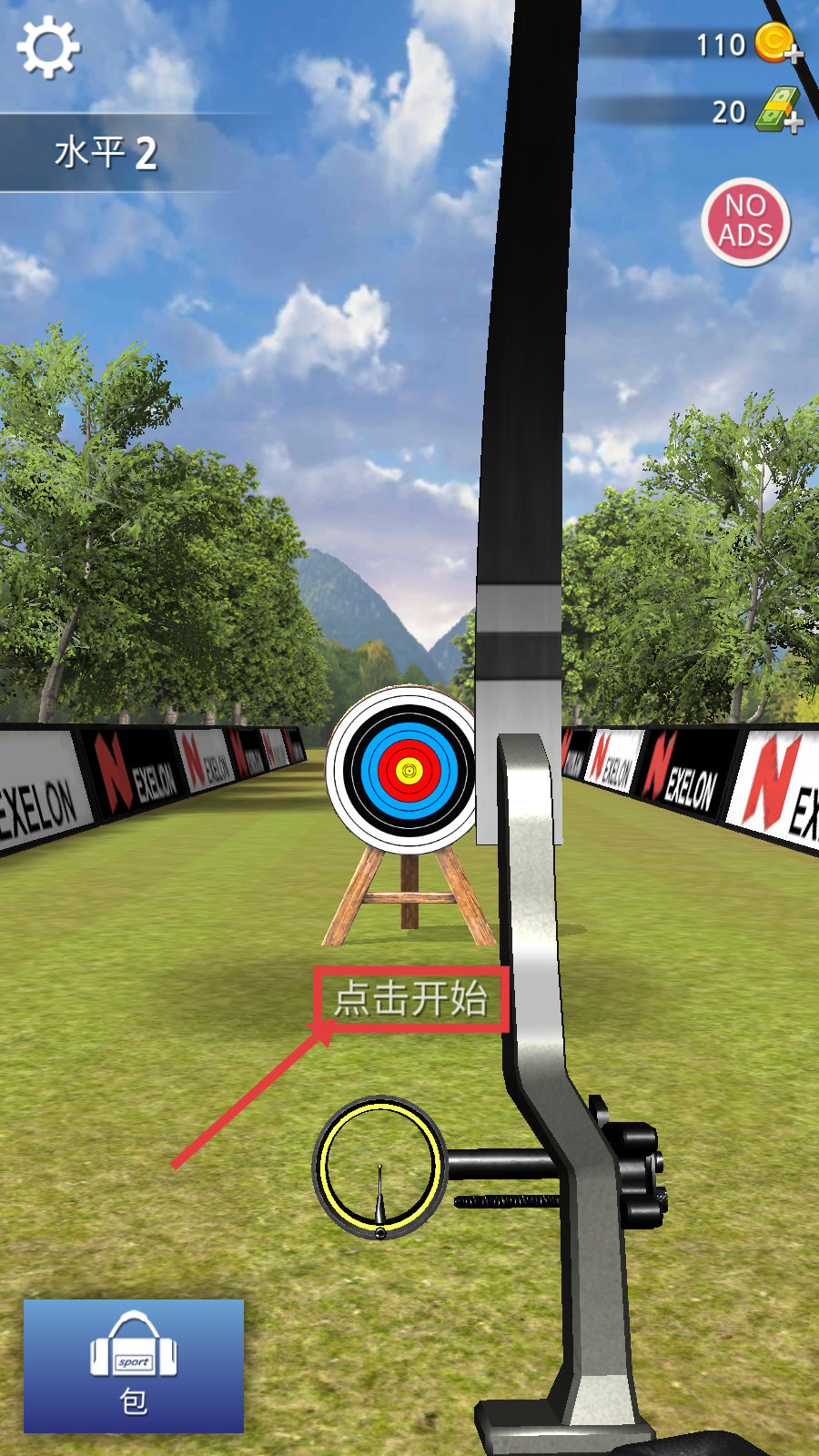 1、进入【水平-2】,看到靶心后点击【点击开始】,准备进行射箭操作,开启本关卡的挑战。