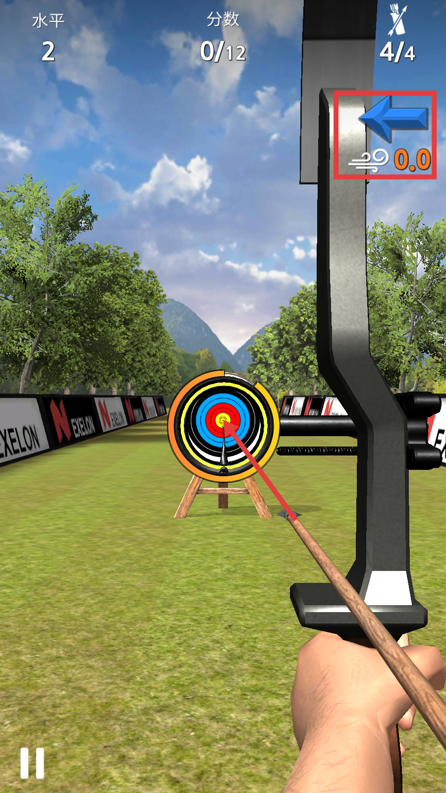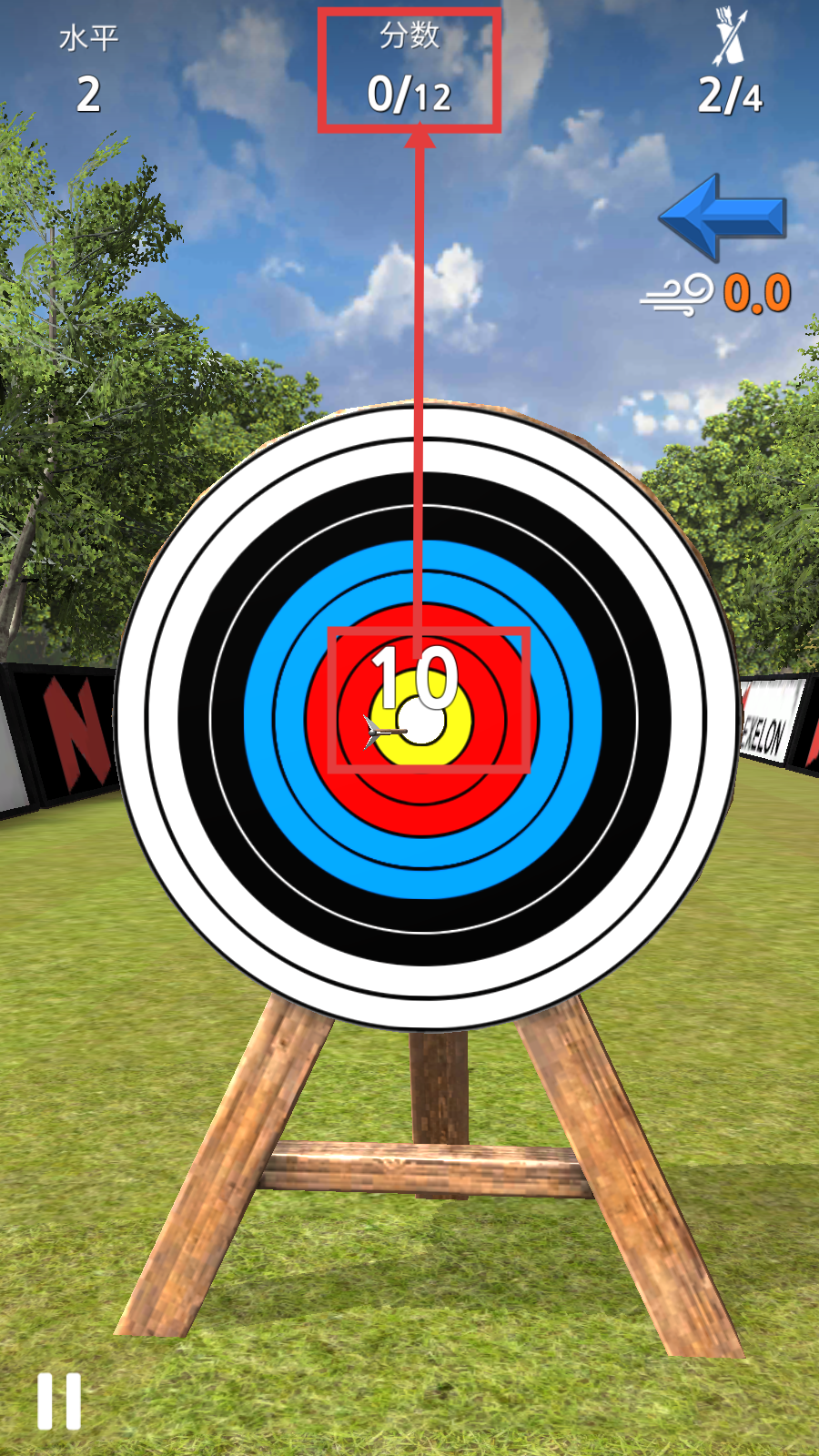 3、尽量将箭矢射向靶心区域,射中可获得分数(如【10】分),需积累分数达到关卡要求的【0/12】目标。