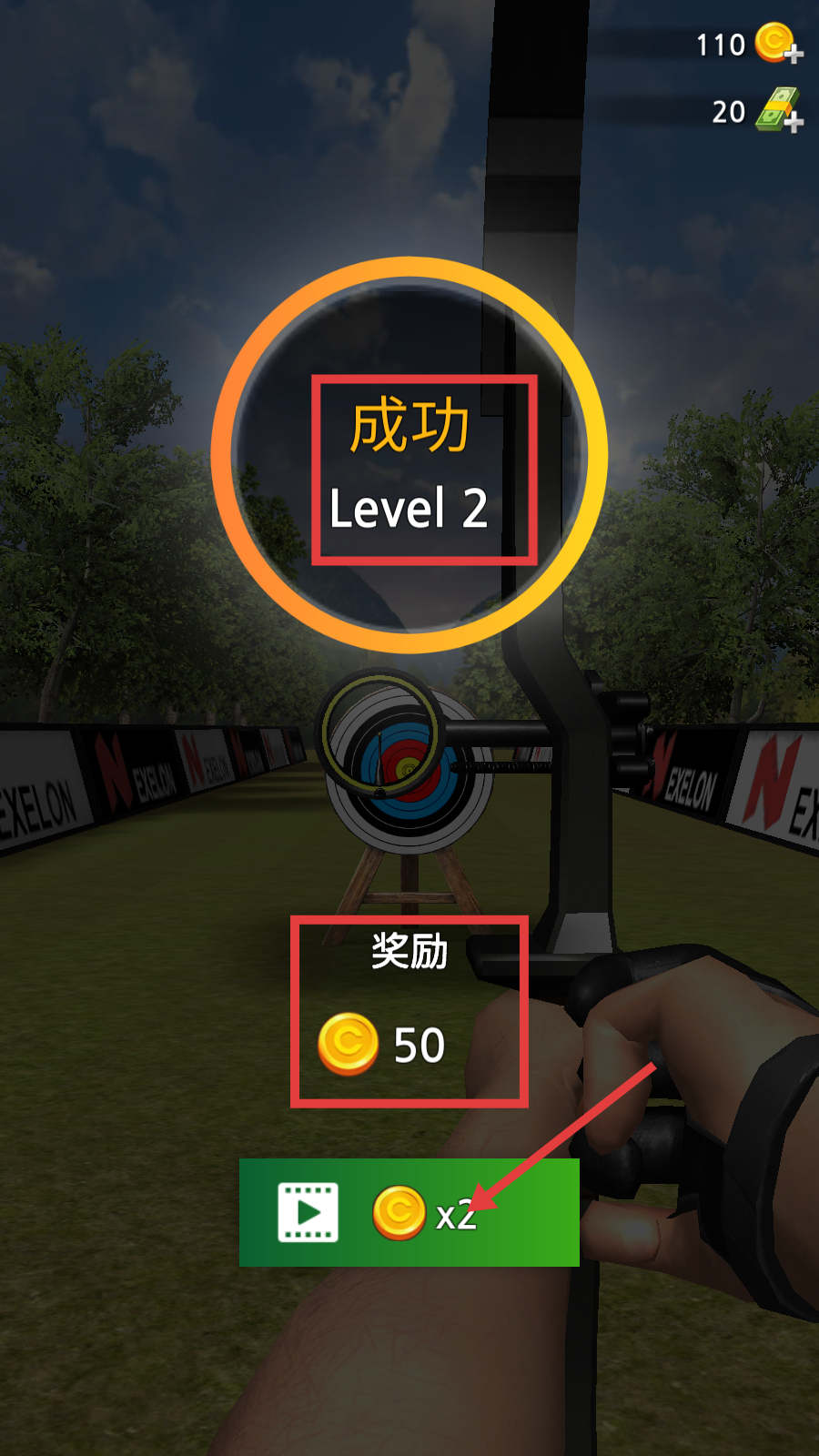 4、成功完成【水平-2】后,界面显示【成功-Level-2】,可获得【50】金币奖励,也可选择观看视频让金币翻倍。