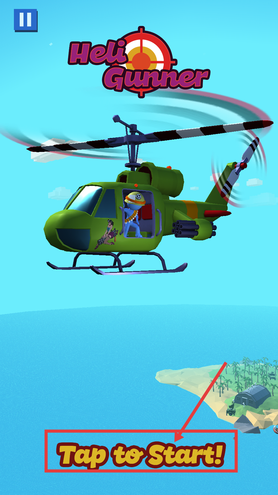 1、进入《HeliGunner》游戏,看到绿色直升机与“Tap-to-Start!”提示后,点击开始,开启直升机射击任务。