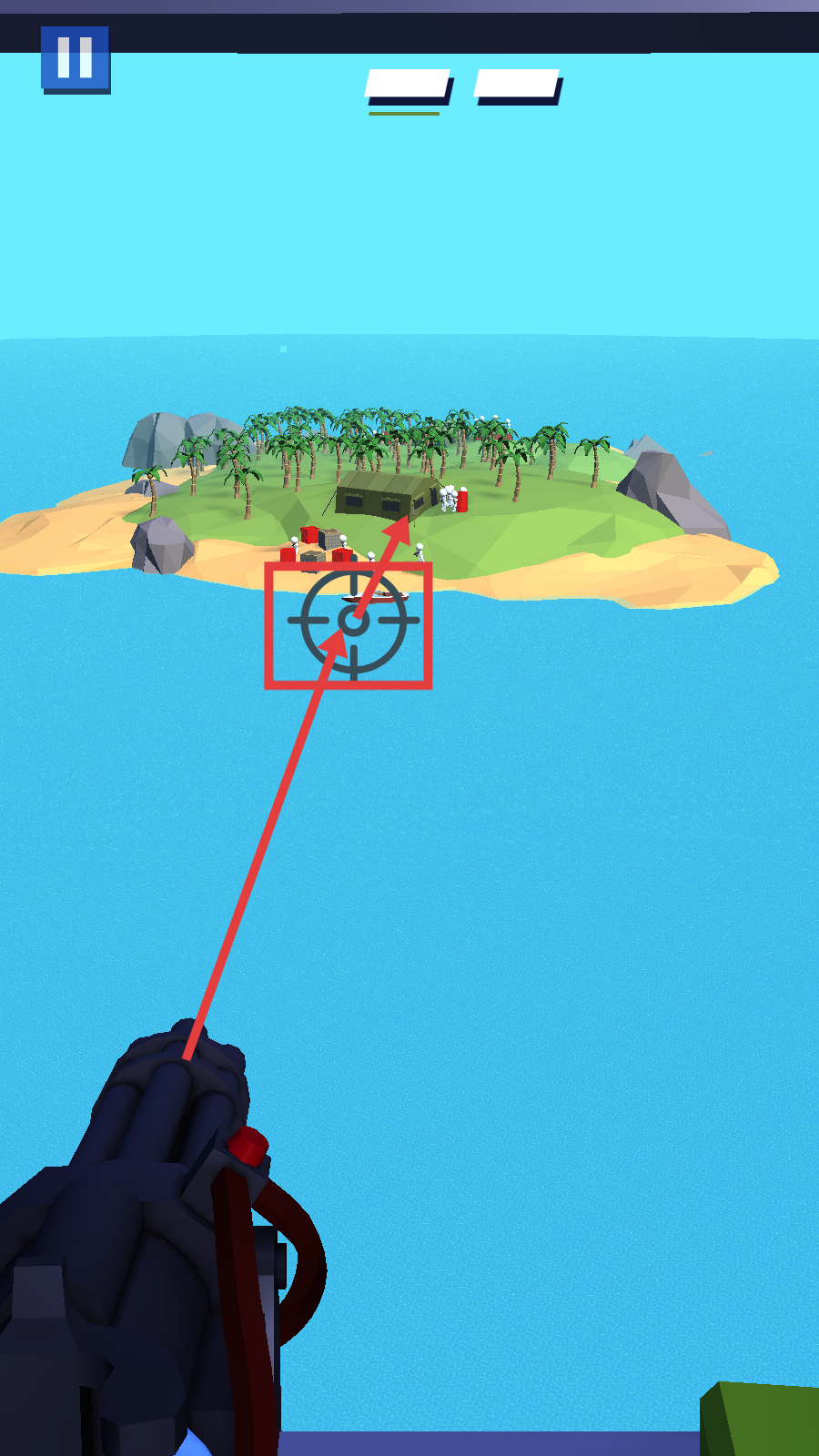 2、操控直升机上的武器,将瞄准镜对准海岛上的目标建筑,准备发起射击,精准锁定敌人据点。