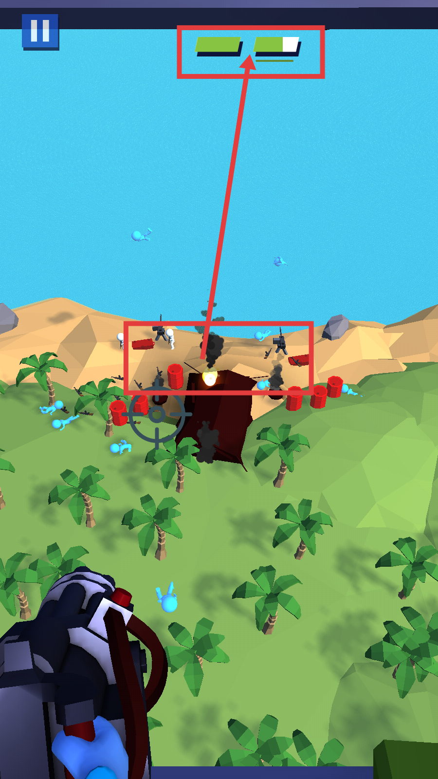 3、射击时留意上方进度条,持续攻击地面的敌人、红色油桶等目标,借助爆炸效果消灭更多敌人,推进任务进度。