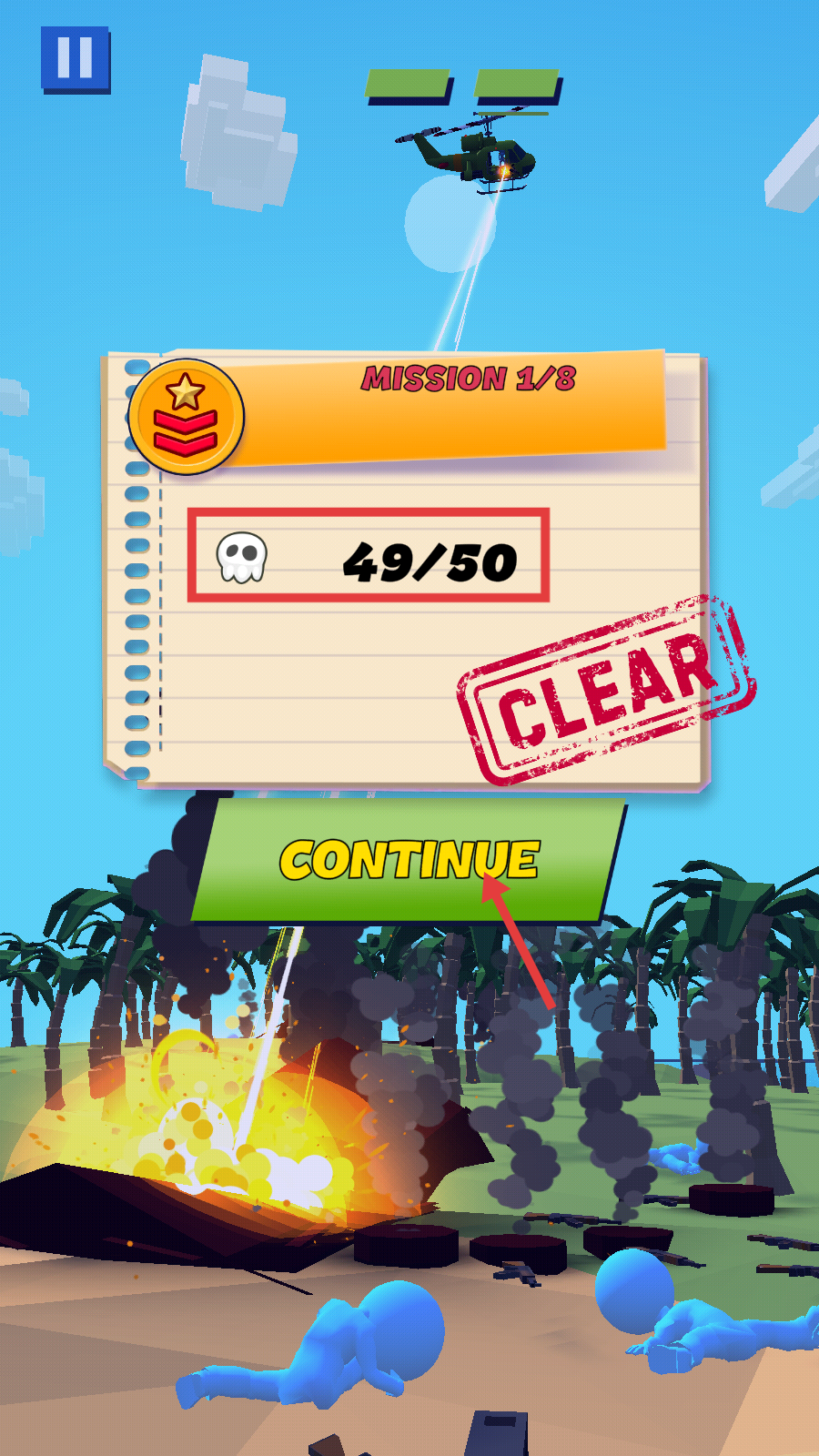 4、完成【MISSION-1/8】,消灭指定数量(如49/50)的敌人后,界面显示“CLEAR”,点击“CONTINUE”可进入下一个任务。