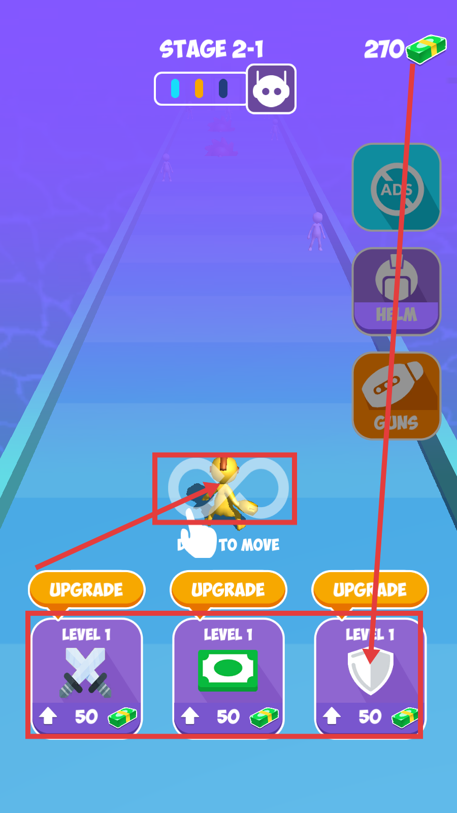 1、进入【STAGE-2-1】后,优先用金币升级【剑】【金钱】【盾牌】这些能力,为闯关打好基础。