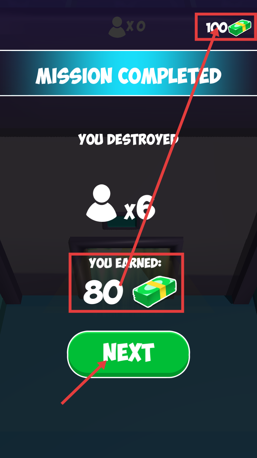 4、完成任务后,界面会显示【MISSION-COMPLETED】,领取【80】和【100】金币奖励,点击【NEXT】进入下一关。