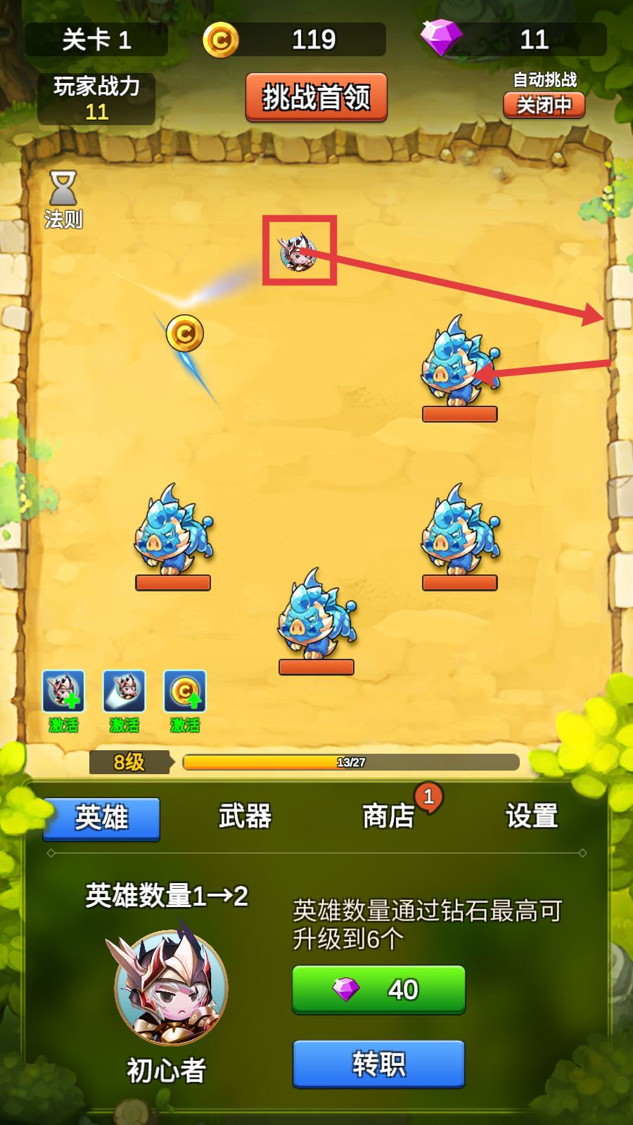 1、关卡1战斗时,操控英雄攻击蓝色怪物,收集金币,也可消耗钻石升级英雄数量,提升作战规模。