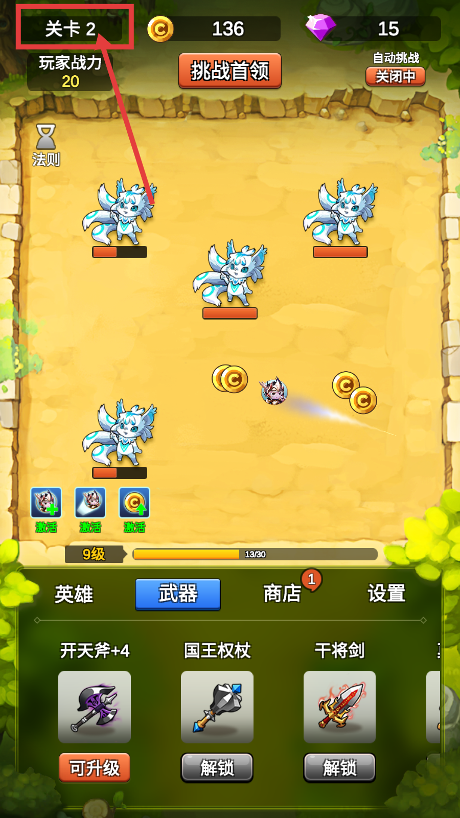 3、获得【开天斧+1】后,花费金币升级该武器,它能增加英雄总攻击,还有概率触发高伤害旋风斩。