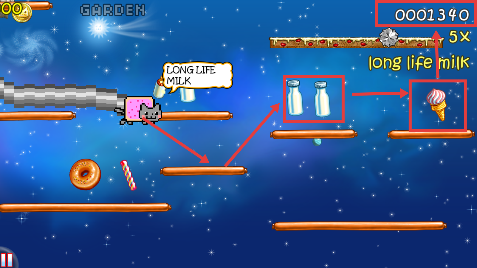 2、在关卡中,操控角色收集【牛奶瓶】,将其组合成【冰淇淋】,同时尽可能获取沿途的甜甜圈,积累分数。