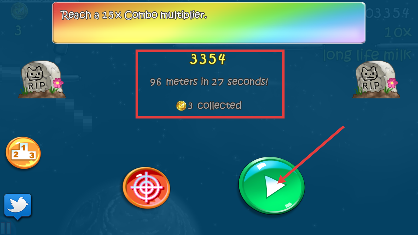 4、每局结束的结算界面,点击【绿色-箭头】按钮,重复挑战关卡,朝着【15×-Combo-multiplier】的目标努力,获取更高分数。