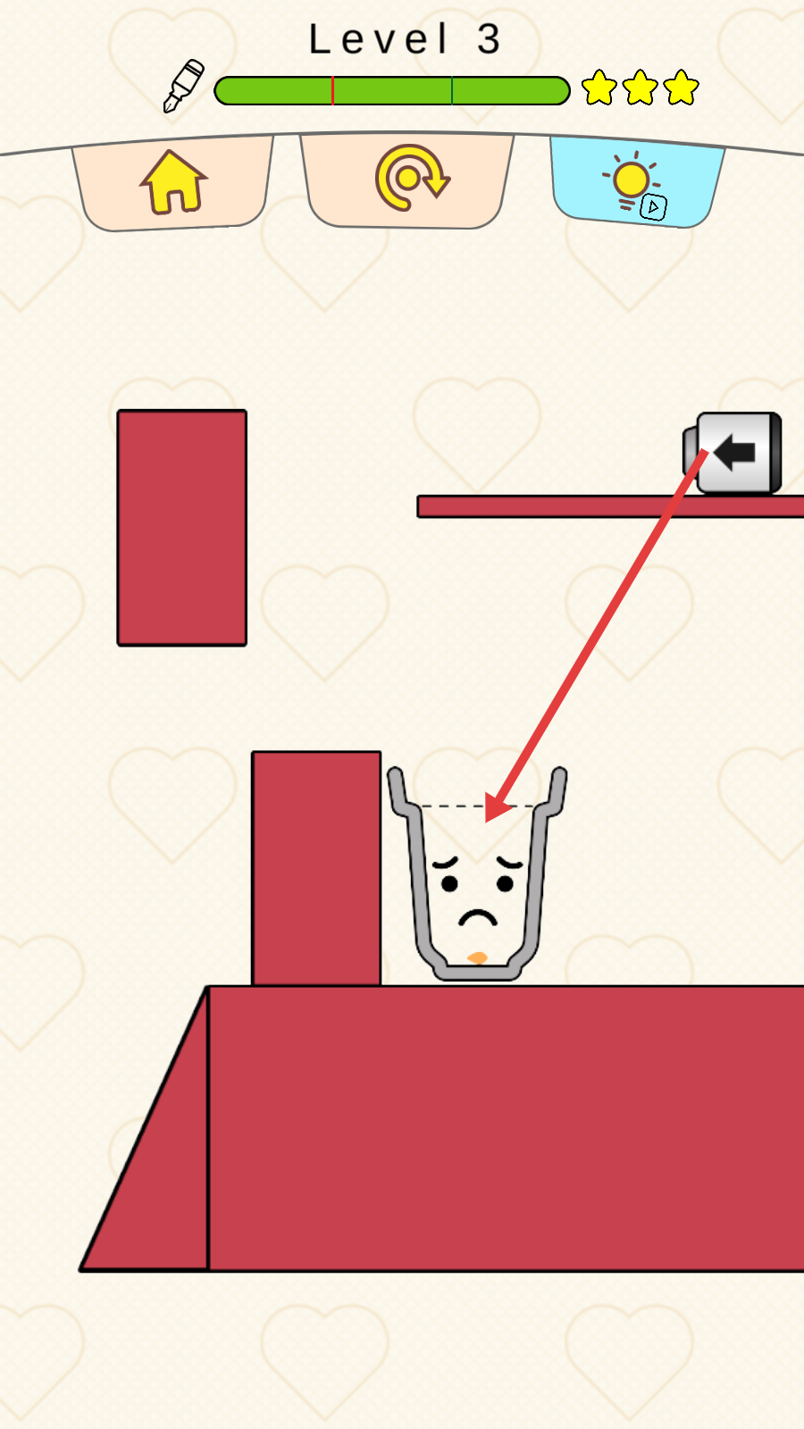 2、在【Level-3】中,观察缺水且呈沮丧状态的杯子与上方带箭头装置的位置,规划水流引导路径。