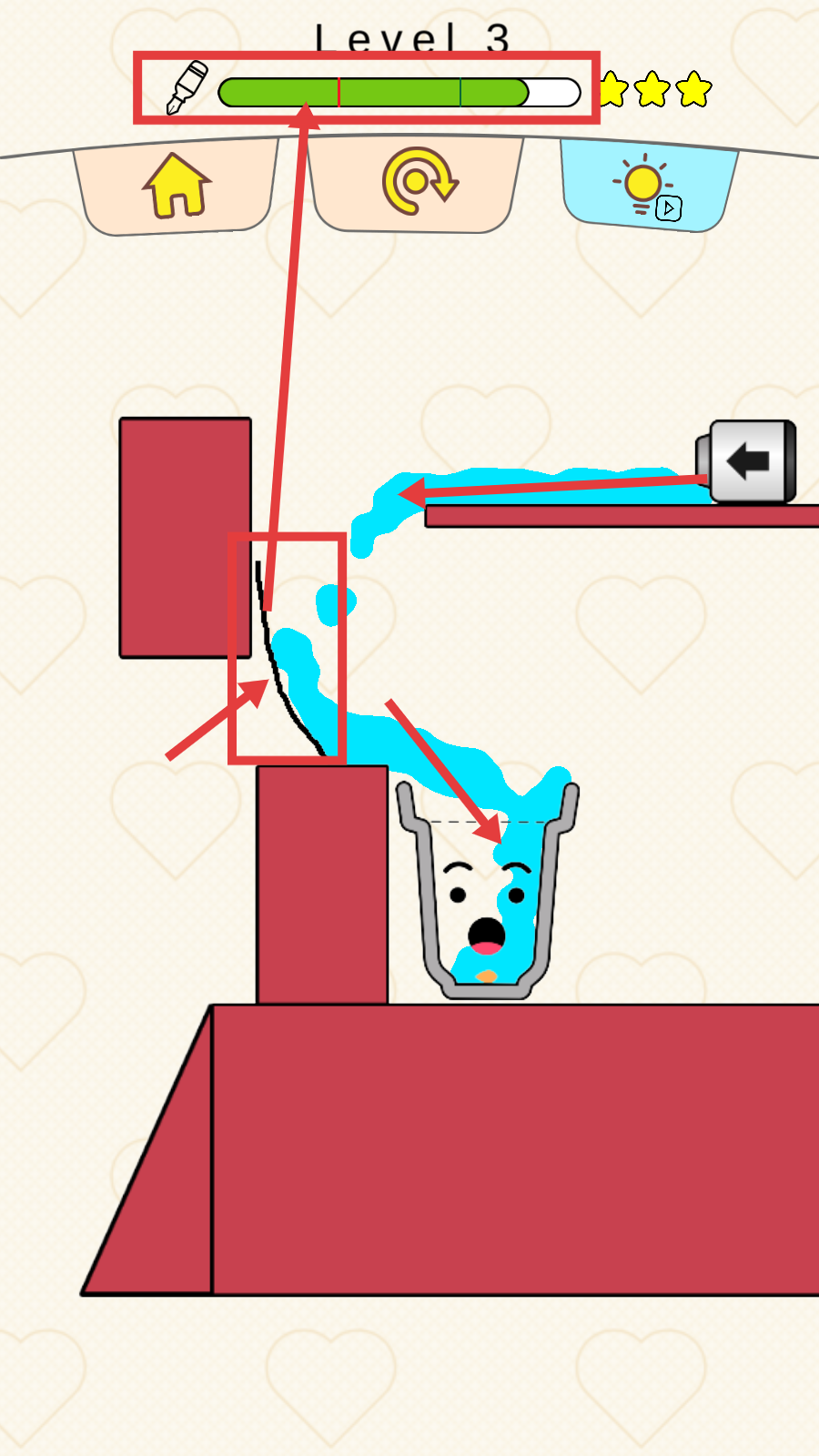 3、用画笔在障碍物间画线条,引导上方装置流出的水注入杯子,随着水流增加,杯子会变开心,上方进度条也会推进。
